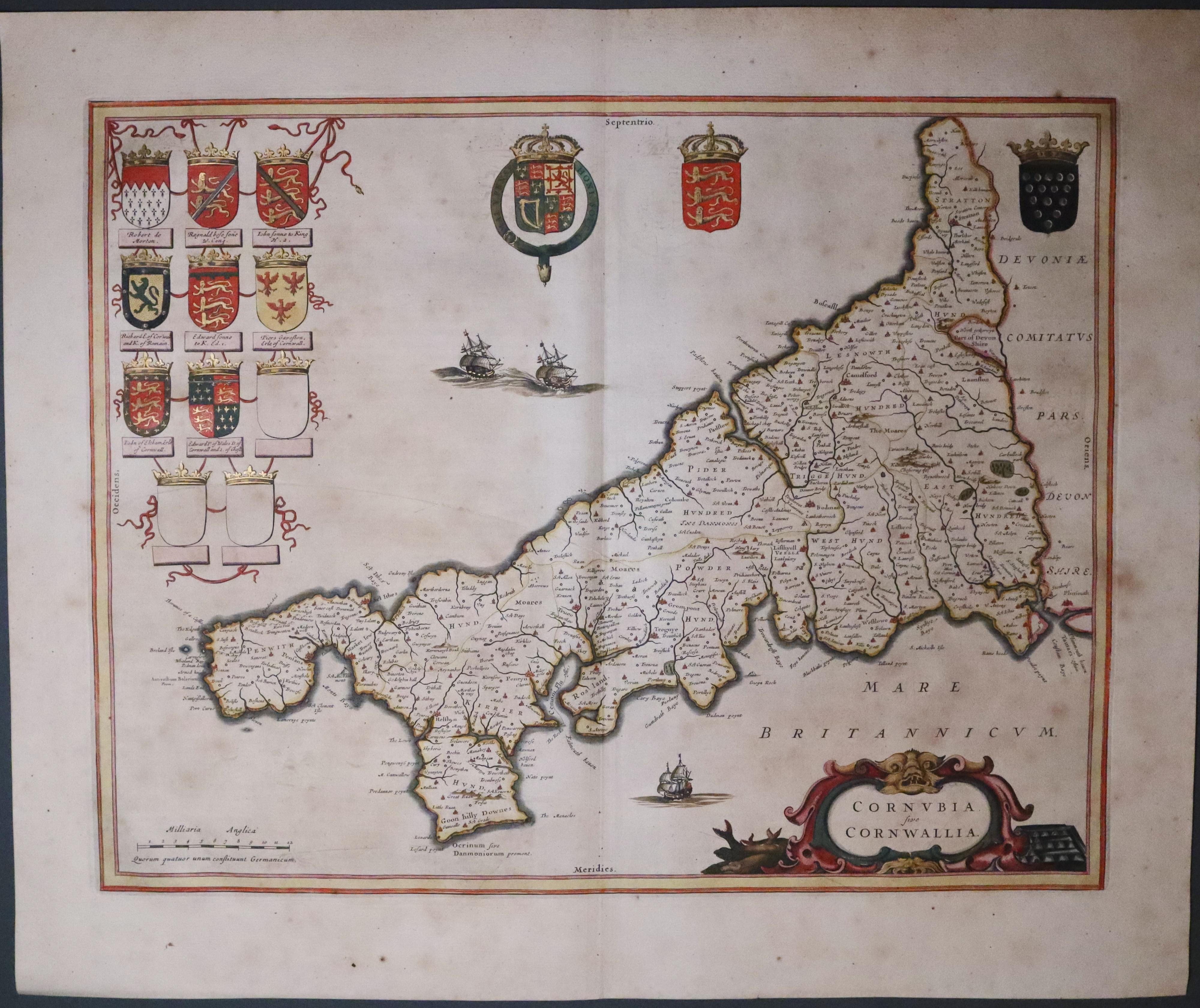 A fine decorative engraved 17th century map of the county. Decorative title cartouche showing fish. Garland of eight coats of arms of the Dukes and Earls of Cornwall with three blank shields. Stuart Royal Arms, Arms of England and the Arms of Cornwall. Three ships in the sea area. 19 1/2 x 15 1/4 inches. Latin text on verso. Early hand colouring heightened with gold. Some scattered areas of light browning otherwise good condition. Nice firm paper.