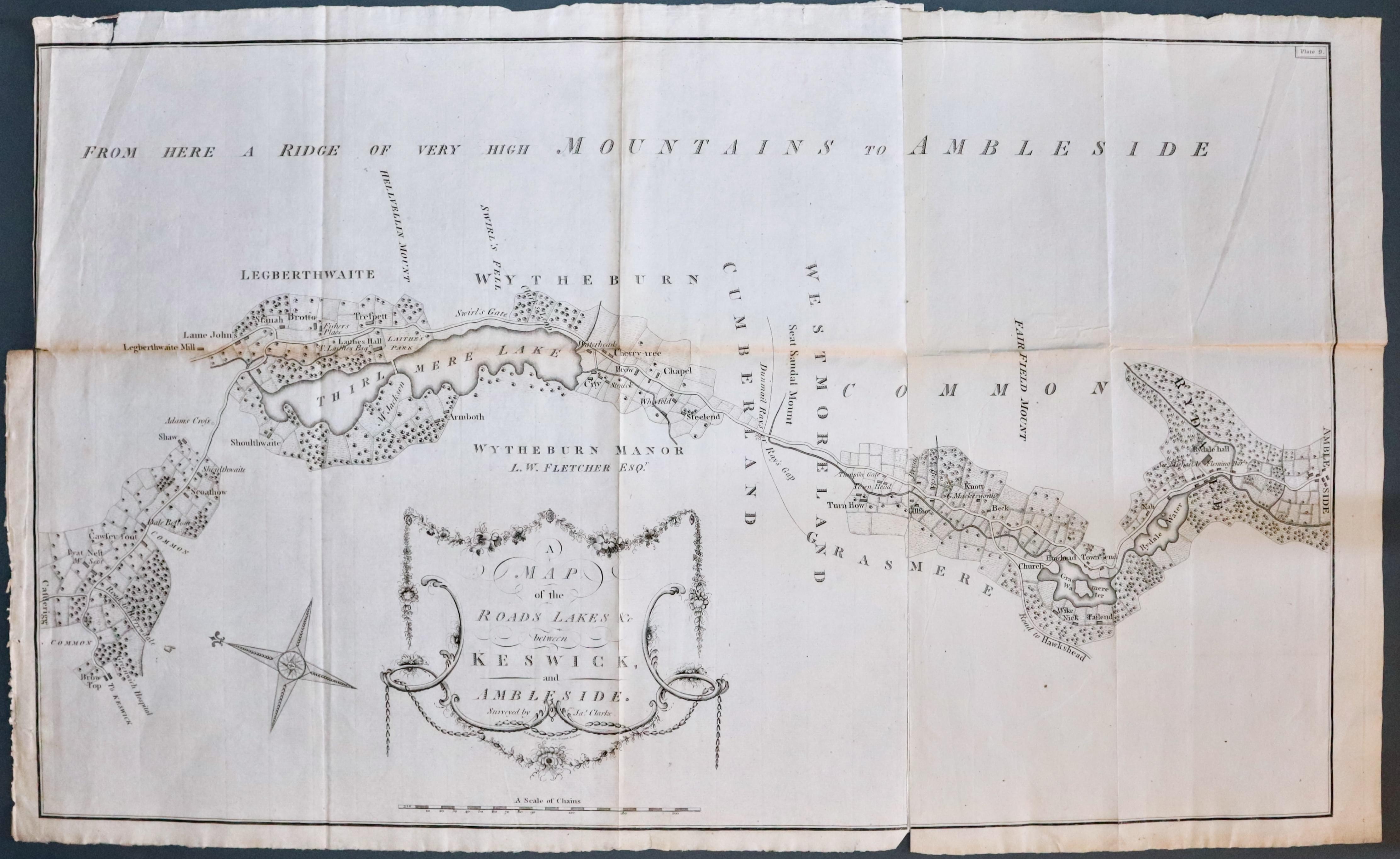 An interesting late 18th century engraved map showing on two sheets the whole lake, islands, Keswick and the surrounding countryside with the names of the landowners. The left hand sheet displays the rococo title cartouche bearing the name of the surveyor James Clarke. Each map measures some 25 1/2 x 18 inches. Uncoloured. Good margins on the top and bottom. Part of the margins on one side of each sheet are missing which is usual owing to the maps being bound into a volume. Each sheet has traces of a horizontal fold and two vertical folds. Good clean condition. The sheets have never been sold before as single maps.