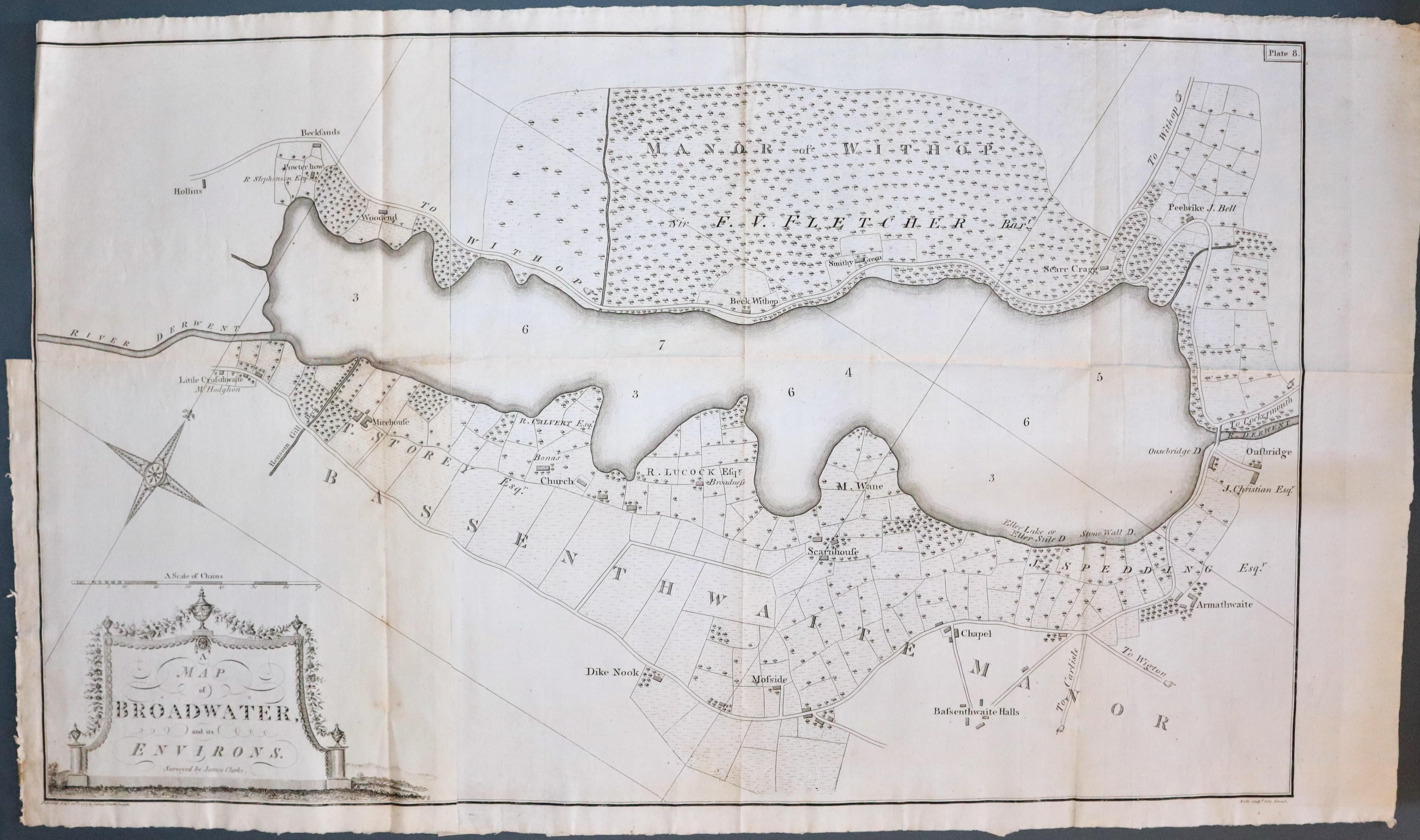 An interesting late 18th century engraved map of when Bassenthwaite Lake was known as Broadwater. The name of the surveyor James Clarke appears at the bottom of the rococo title cartouche. The map shows the area in gret detail with the roads and names of the landowners. This is Plate 8 of a series of 11 maps of the Lake District by James Clarke. Decrative compass rose beneath which is a scale in chains. Section of the left hand margin missing which is common owing to how the map was bound into the volume. The right hand blank margin is very wide so part could be used to repair the left hand margin. 30 1/4 x 18 1/4 inches. Uncoloured. Three vertical fold creases and one horizontal as published.