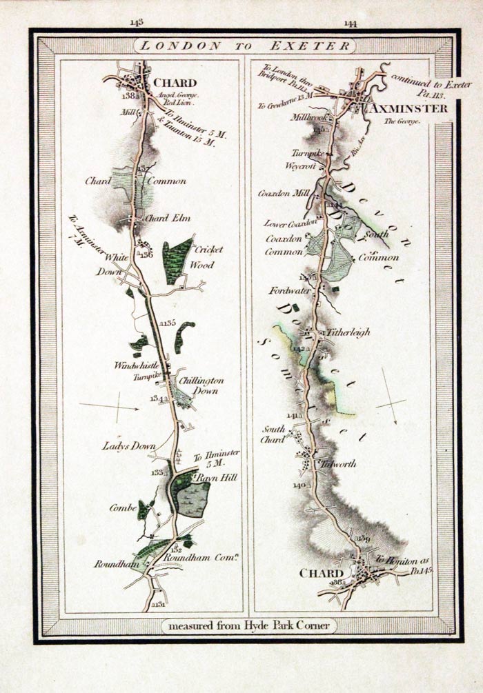 Plates 161 & 162 London to Exeter road map by Edward Mogg 1800