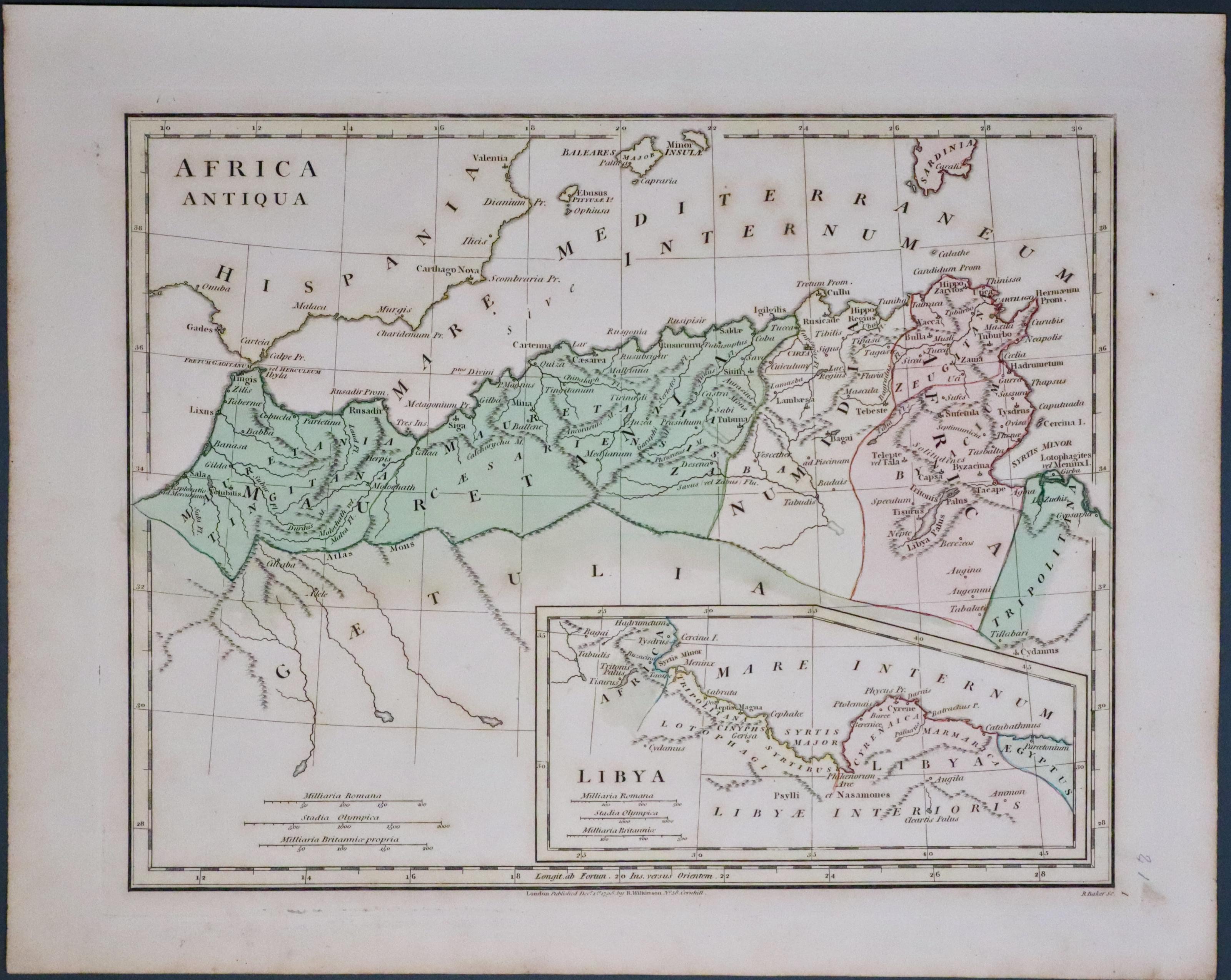 An interesting engraved map of North Afriuca in Ancient Times. The eastern par of the coast is continued within an inset panel titled Libya. Publishers imprint beneath London Published Dec. 1st 1798 by R. Wilkinson No. 58 Cornhill. 11 8 1/2 inches. Attractive early outline and wash hand colouring.