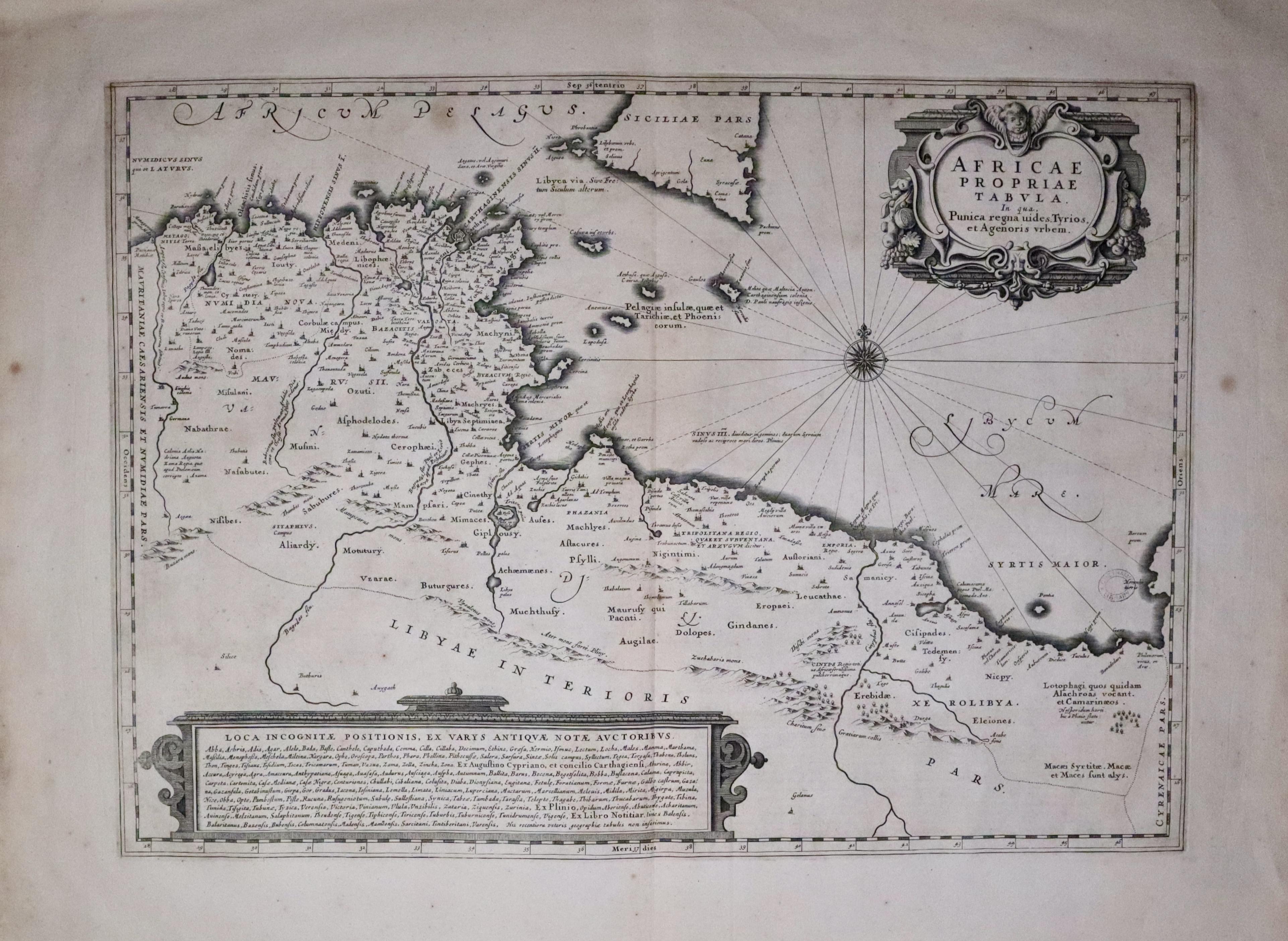 An engraved map based upon an earlier map by Abraham Ortelius. It shows in ancient times part of the coast of north Africa showing the present day Tunisia and Libya. It shows part of Sicily as well as Malta and its neighbouring islands. Two decorative cartouches display the title and text. 20 1/2 x 14 1/2 inches. Uncoloured. Small Chethams Library stamp in the sea area. Original centre fold. Very lightly toned. Two spots in the wide blank margins. Smnall slit at the top of the centre fold. Otherwise good condition