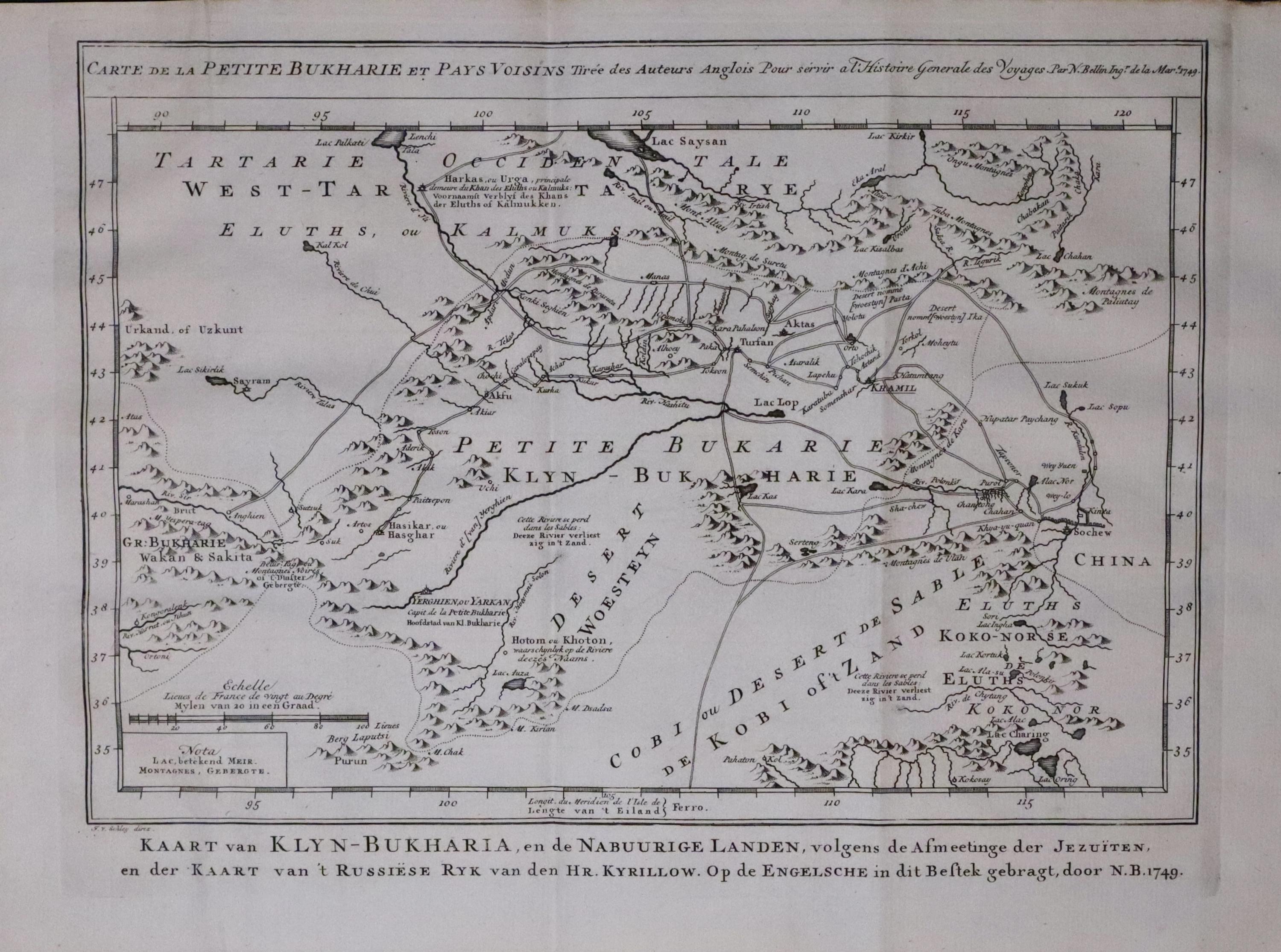 An engraved map of Central Asia including Uzbekistan, Tajikistan, Turkmenistan and Kyrgyzstan along with the area of Xinjiang in north western China. Above the map is a French title and beneath a Dutch title. Uncoloured. Traces of three original vertical folding creases.12 x 8 1/2 inches. Uncoloured. Good condition.