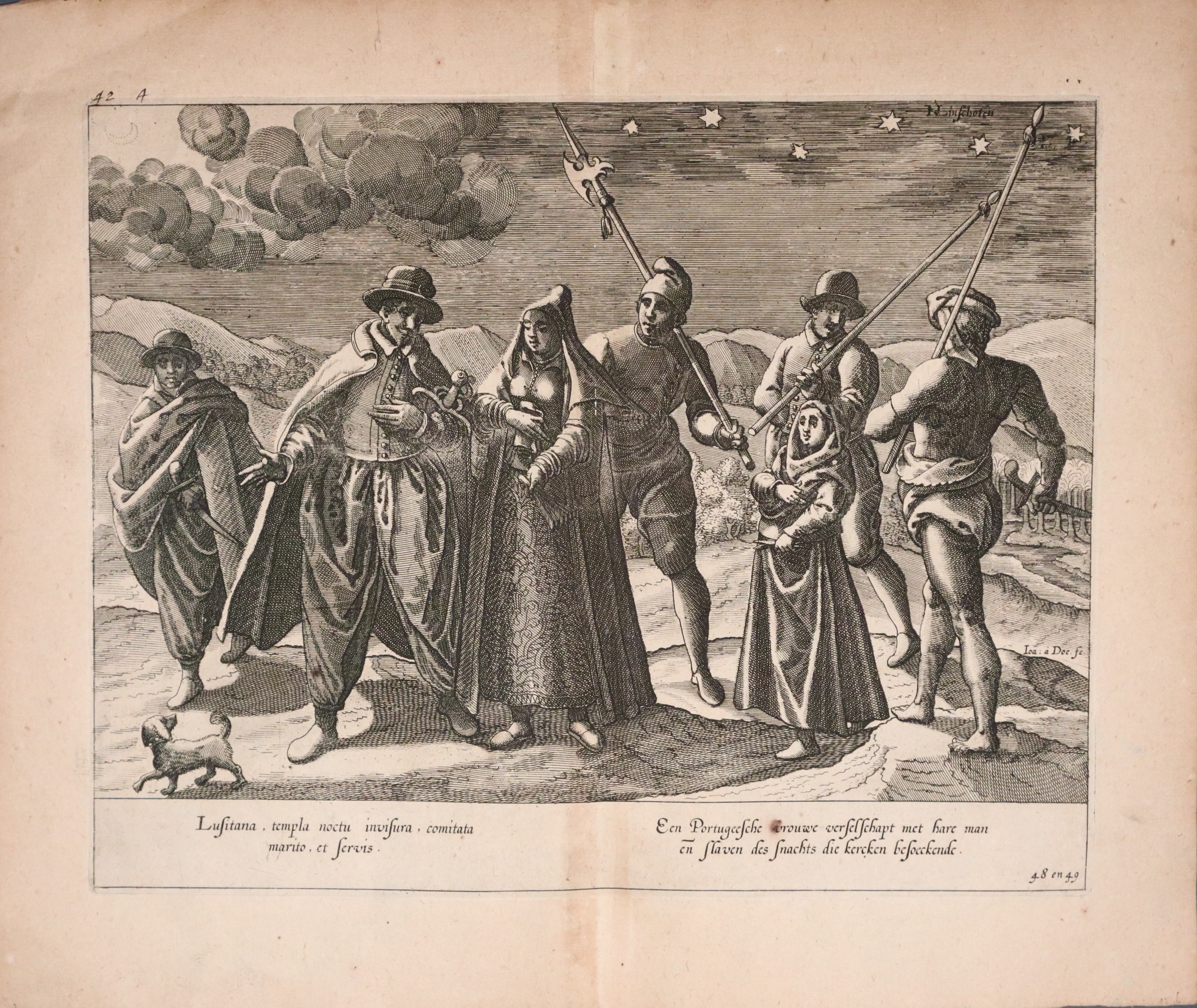 An uncoloured engraving showing a Portuguese couple from Goa out at night with a dog and other figures including three pikemen. Tiles in Latin and Dutch below. Original centre fold. 12 1/4 x 9 3/4 inches. Good condition.