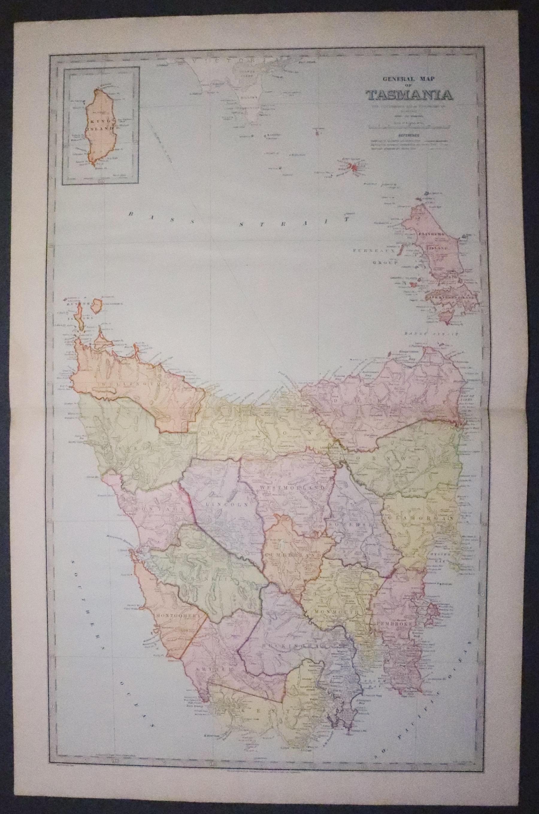 A good large coloured lithograph map of the island from The Picturesque Atlas. Small inset of King Island. Long list of towns and places on Tasmania with their map reference on verso with small view. 23 3/4 x 14 1/2 inches. Good clean condition.