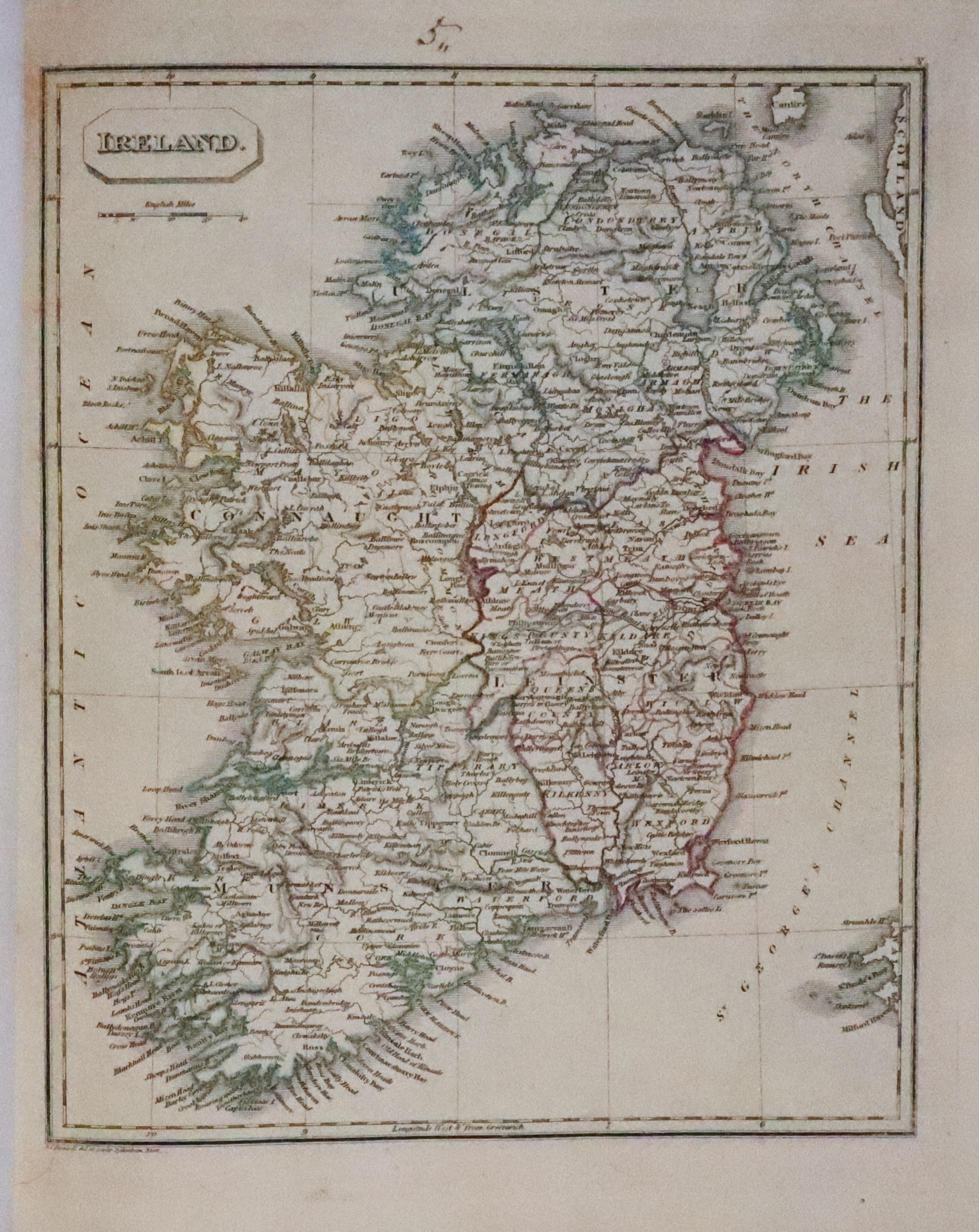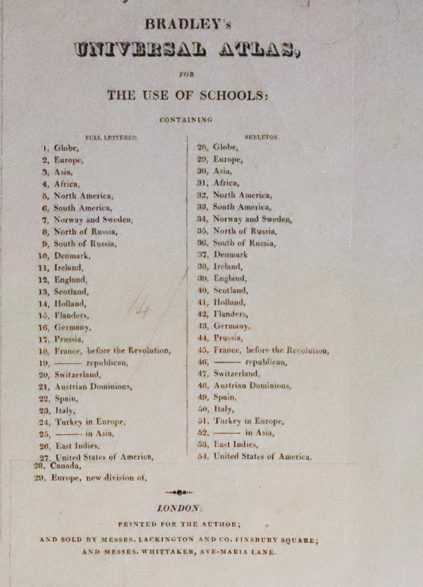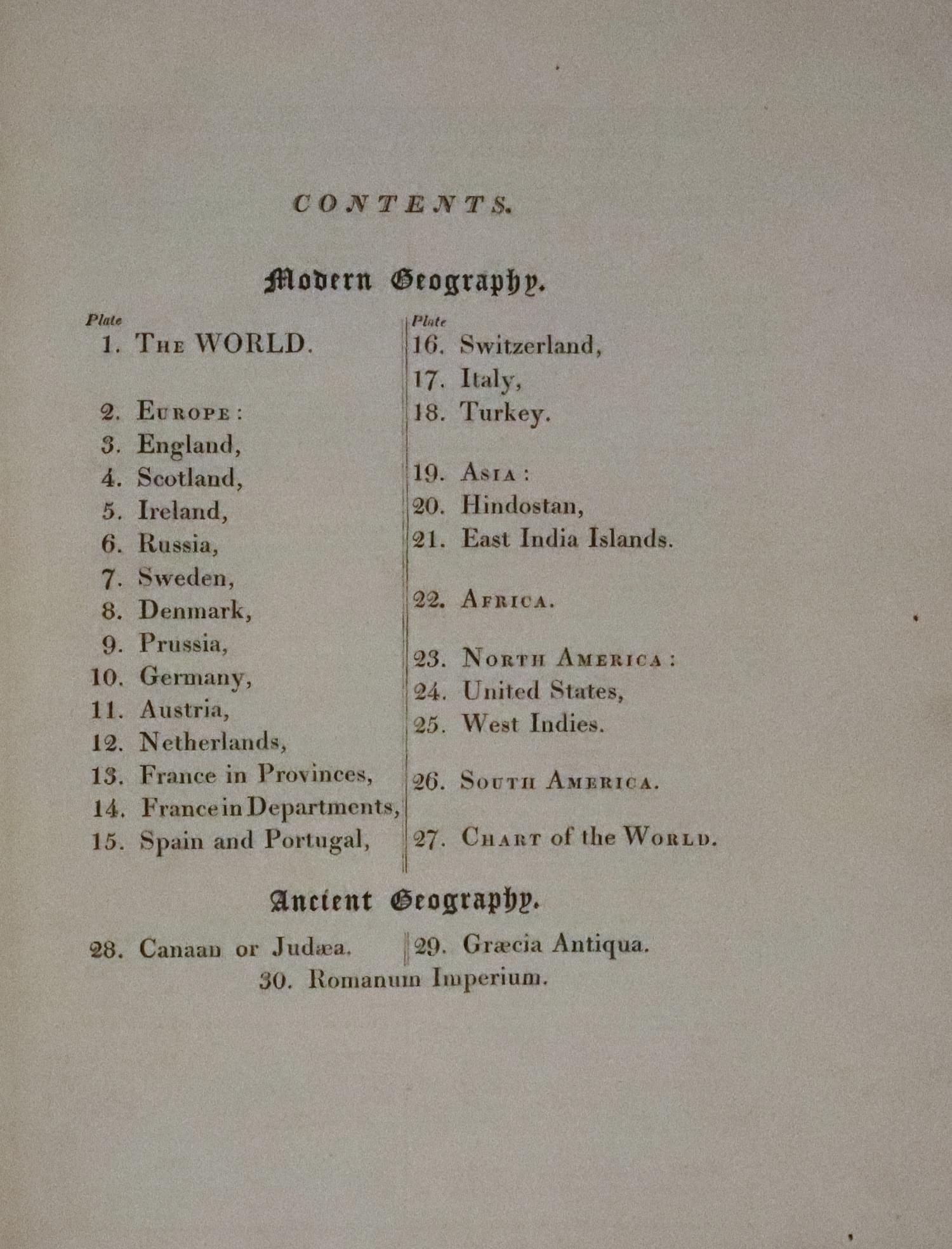 No title page to this atlas which is possible missing. The title is shown on a pasted page onto the inside of the front board which lists the maps to which an additional piece of printed text has been pasted listing two further maps - Canada and New Division of Europe. Printed for the Author; and Sold by Messers. lackington and Co. Finsbury Square; and Messers. Whittaker, Ave-Maria Lane, London. There are 29 normal hand coloured engraved maps each bearing a publishers imprint “Engraved for J. Bradley’s Elements of Geography. These are followed by 27 hand coloured engraved maps titled but having no place names. Designed for educational use. Small corner missing of the wide blank margin on the Austrian Dominions map. Otherwise the maps are in nice order. Scattered very light browning on some maps but otherwise a nice specimen. Marbled boards with printed text showing through or transfered from with pasted title label. Quarter bound. Bookplate of R. H. Johnstone