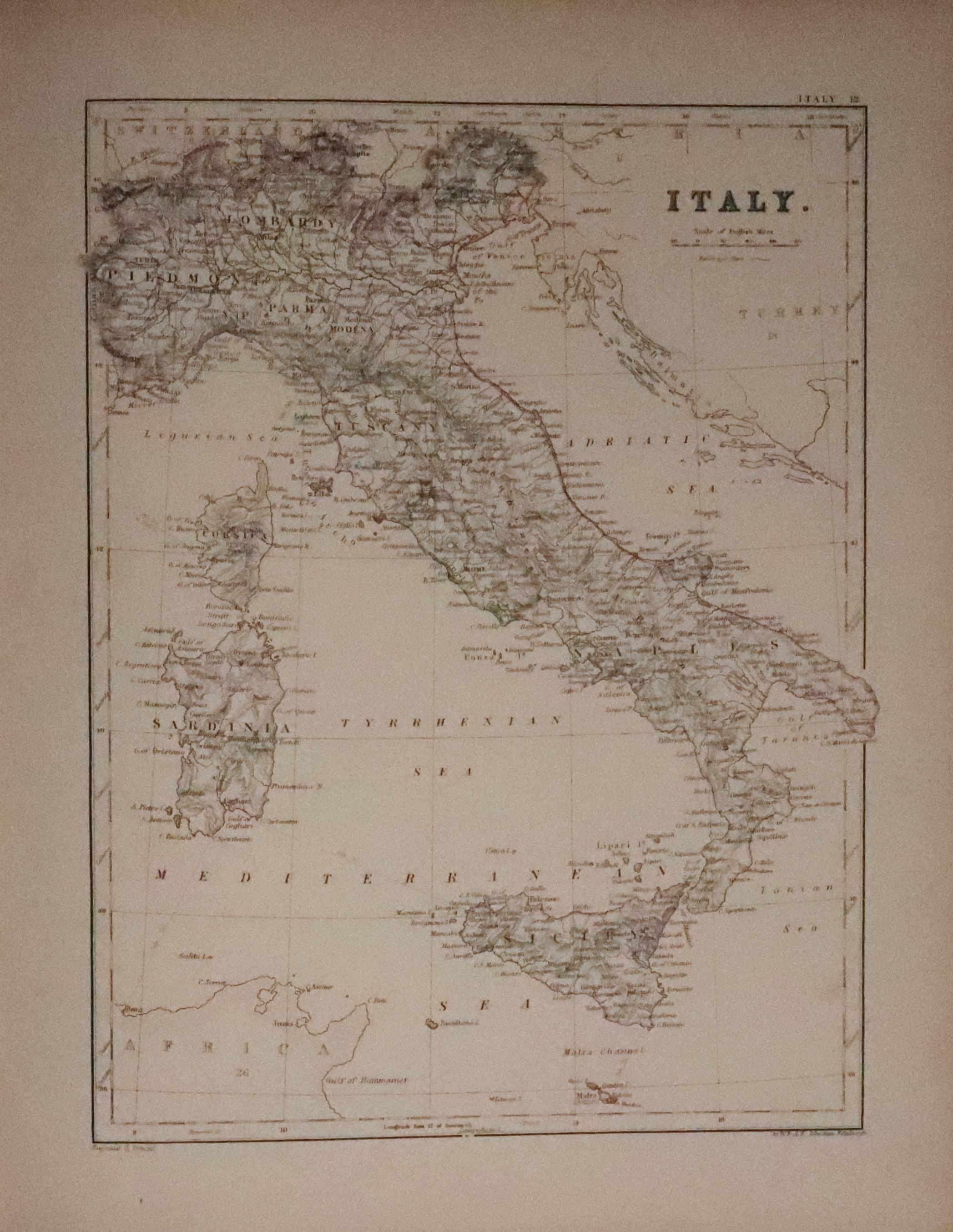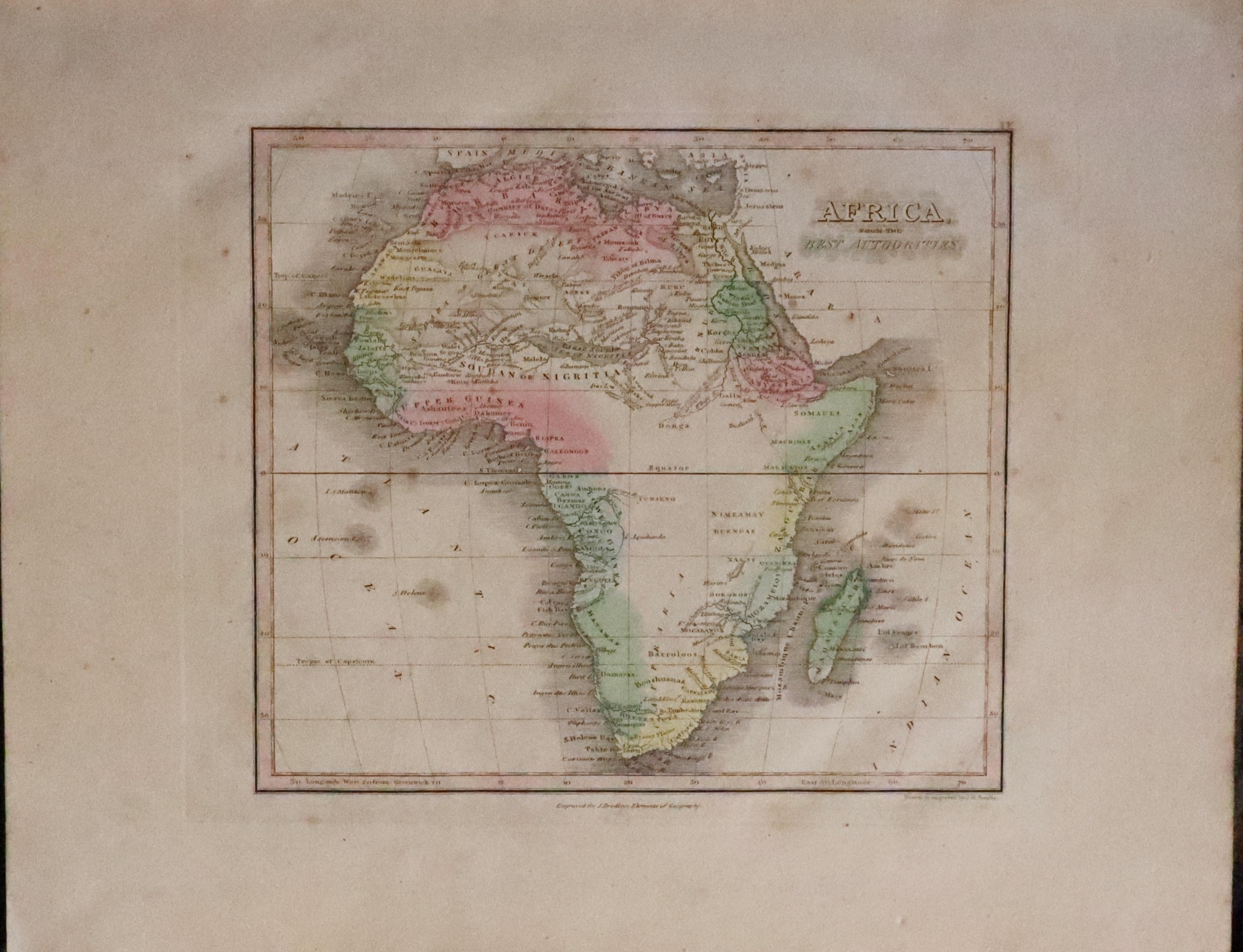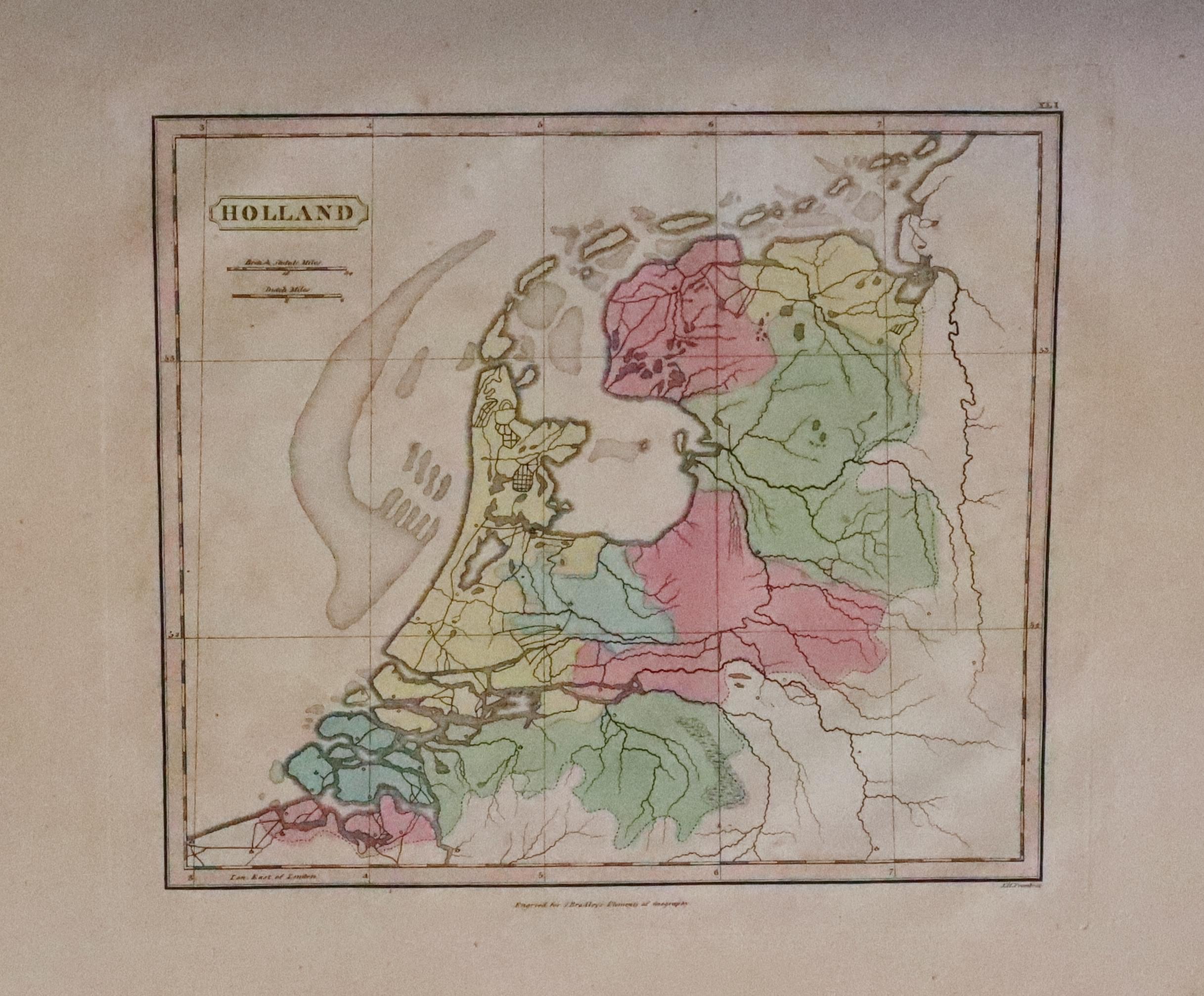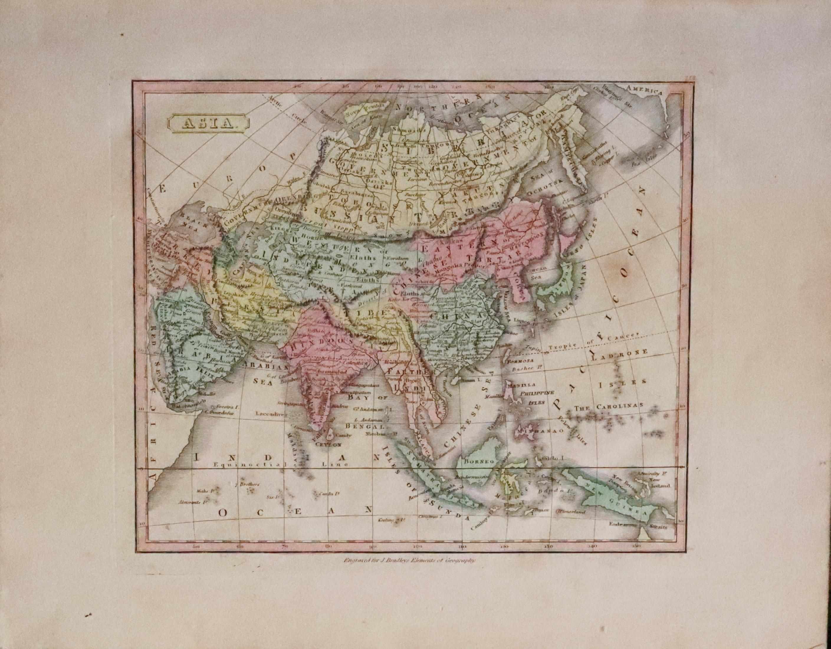 No title page to this atlas which is possible missing. The title is shown on a pasted page onto the inside of the front board which lists the maps to which an additional piece of printed text has been pasted listing two further maps - Canada and New Division of Europe. Printed for the Author; and Sold by Messers. lackington and Co. Finsbury Square; and Messers. Whittaker, Ave-Maria Lane, London. There are 29 normal hand coloured engraved maps each bearing a publishers imprint “Engraved for J. Bradley’s Elements of Geography. These are followed by 27 hand coloured engraved maps titled but having no place names. Designed for educational use. Small corner missing of the wide blank margin on the Austrian Dominions map. Otherwise the maps are in nice order. Scattered very light browning on some maps but otherwise a nice specimen. Marbled boards with printed text showing through or transfered from with pasted title label. Quarter bound. Bookplate of R. H. Johnstone