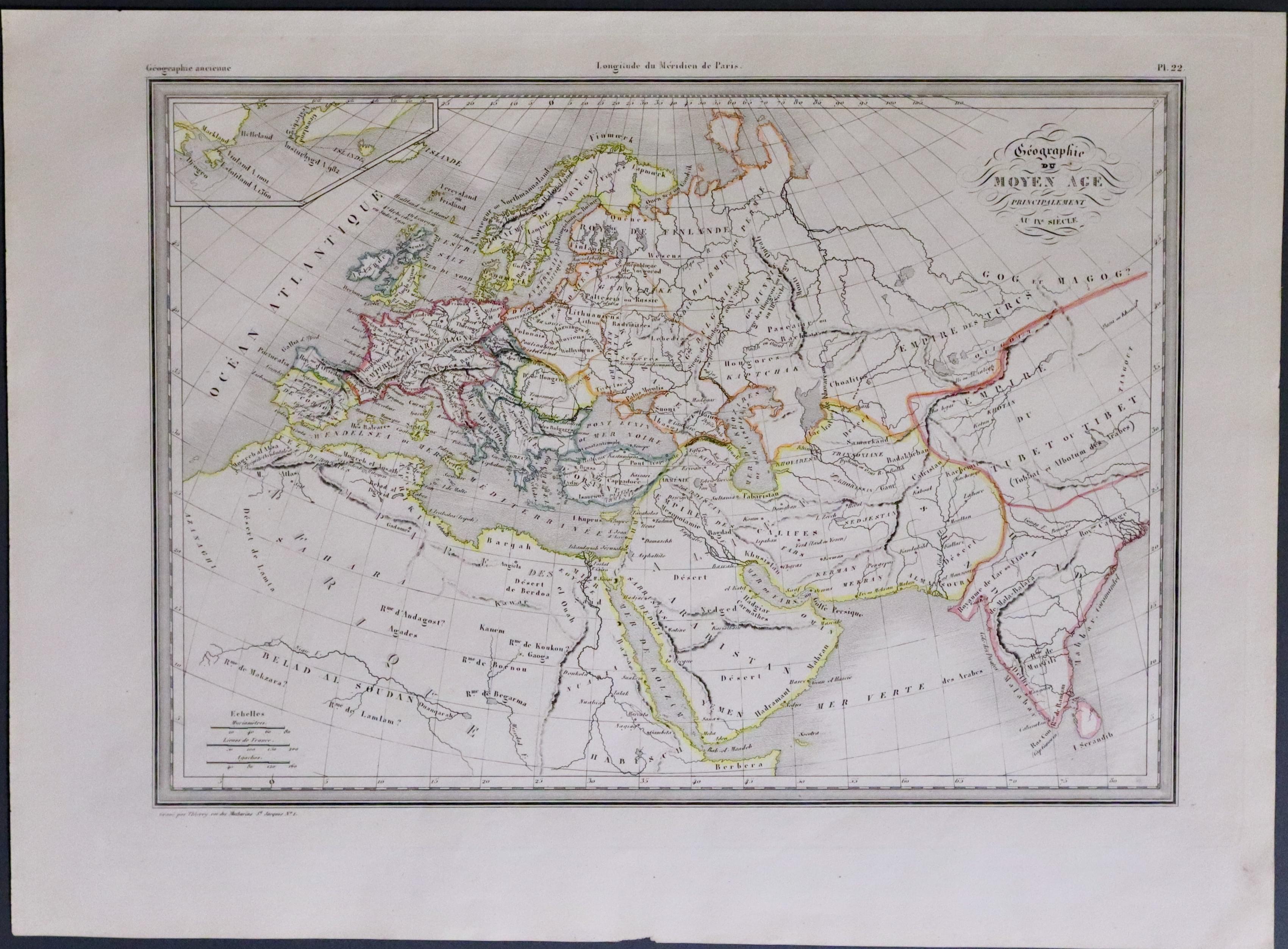 An engraved map Europe and part of Asia in the Middle Ages. Moyen Age is a French term for the period of European History in the 5th to 15th centuries. 12 1/4 x 8 3/4 inches. Original outline hand colouring. Good condition.