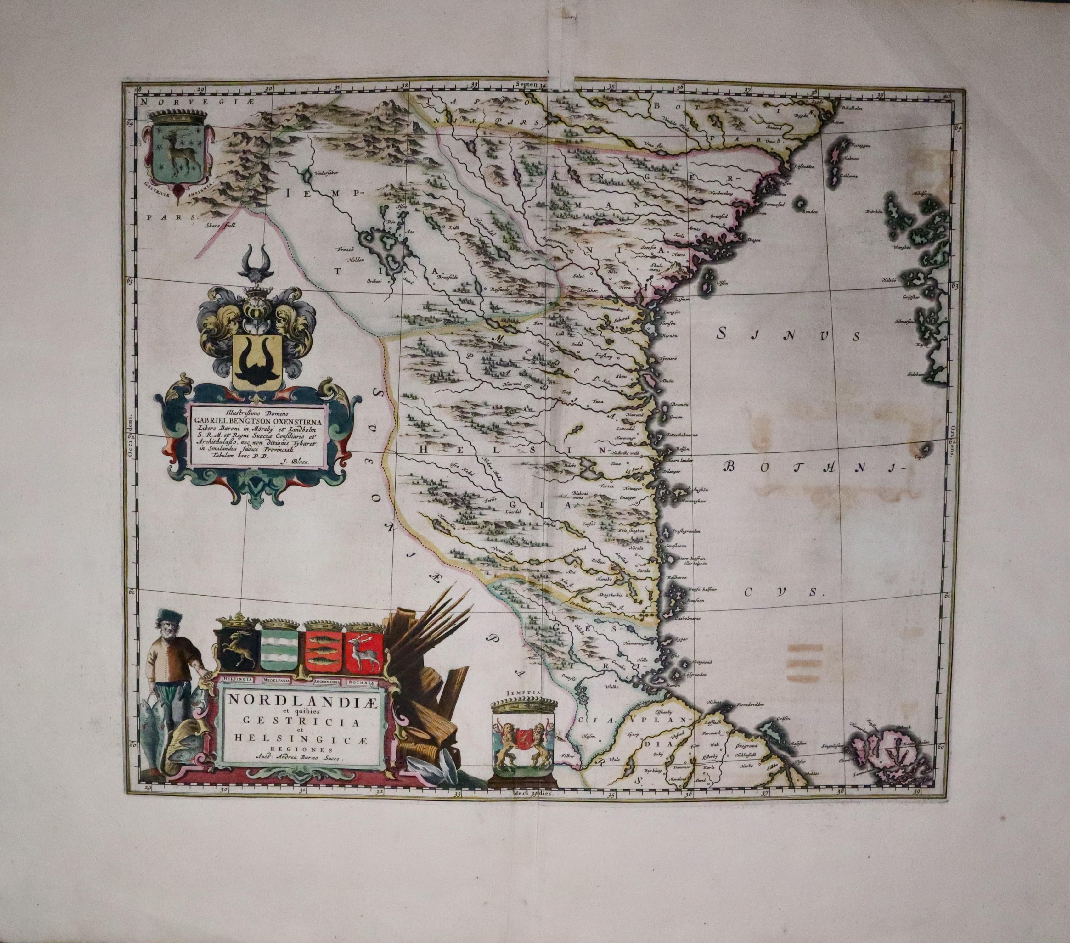 A fine 17th century engraved map of Sweden embellished with a title cartouche with a figure and coats of arms, a dedication to Gabriel Bengtsson Oxenstierna within a cartouche with coat of arms and two separate coats of arms. The title cartouche bears the name of the cartographer Anders Bure (1571 - 1646) A mathematician, instrument maker and one of the most important cartographers associated with Scandinavian cartography. 18 3/4 x 16 inches. Original hand colouring. Large blank margins. Light crease to the right of the original centre fold. A little abrasion at the top of the centre fold printed border. Further up the centre fold there is a small square hole in the blank margin.