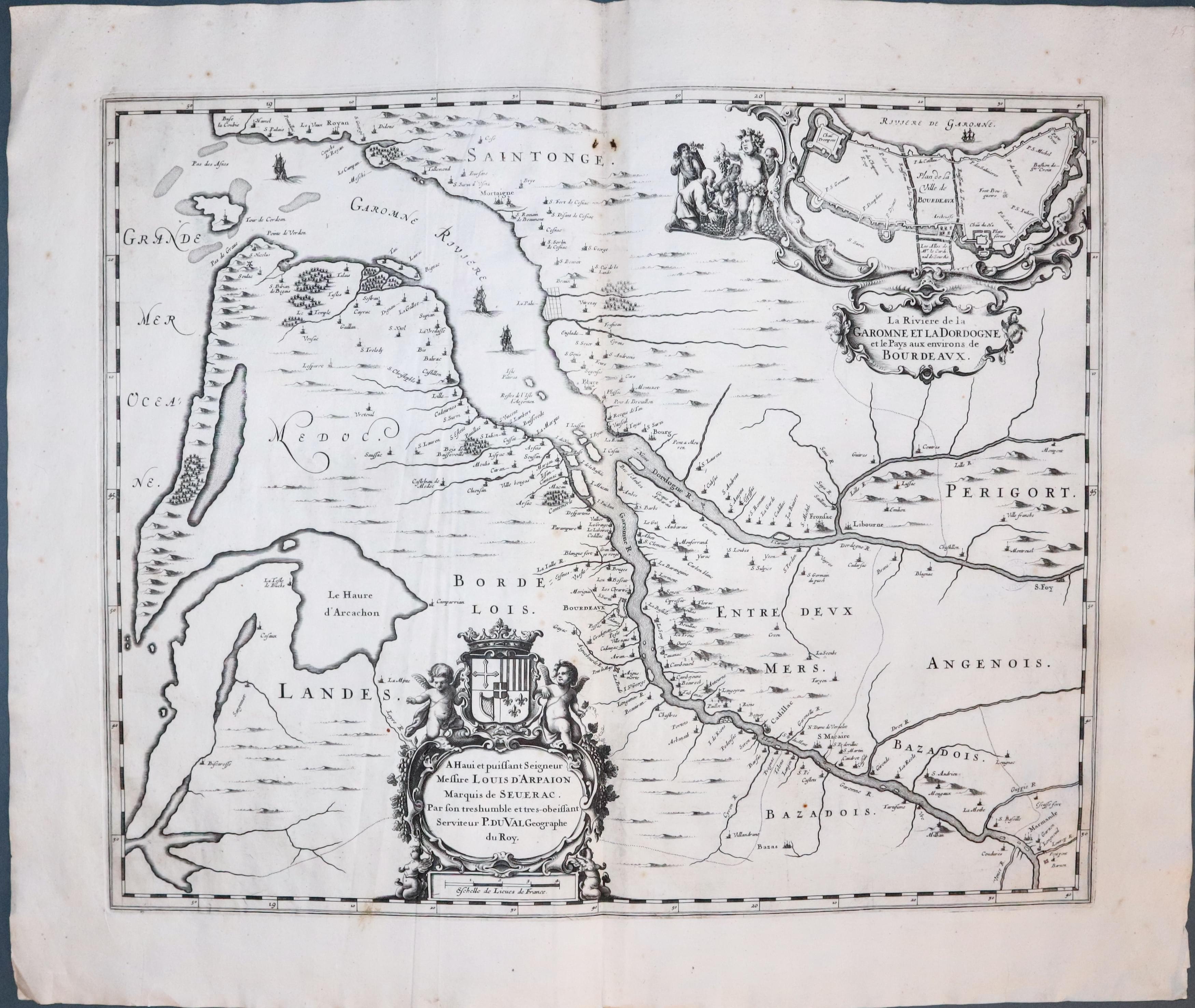 An impressive looking engraved map of the Gironde estuary where the Dorgogne River and Garonne River meet. The map is embellished with two decorative cartouches. The title cartouche has an inset plan of Bordeaux and putti. The dedication cartouche is surmounted buy a coat of arms and two putti with the scale beneath. 20 3/4 x 17 inches. Uncoloured. Original centrefold. Large blank margins. There is some light creasing mainly to the left hand side of the map. Good clean condition.