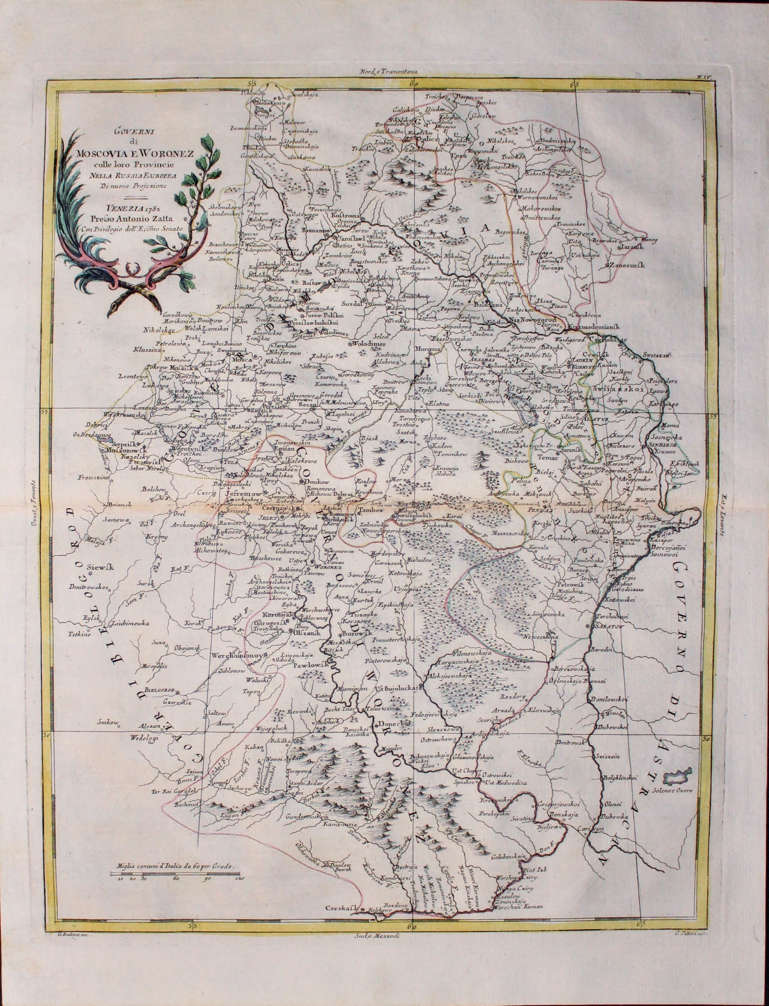 An engraved map of this large area of western Russia in Europe. Pictorial title cartouche dated 1782. Engraved by Giuliano Zuliana to appear in “Atlante Novissimo” by Antontio Zatta. 13 x 16 3/ inches. Early hand colouring. Original centre fold. Fine clean crisp condition having just been taken from the atlas and not sold previously as a single map.