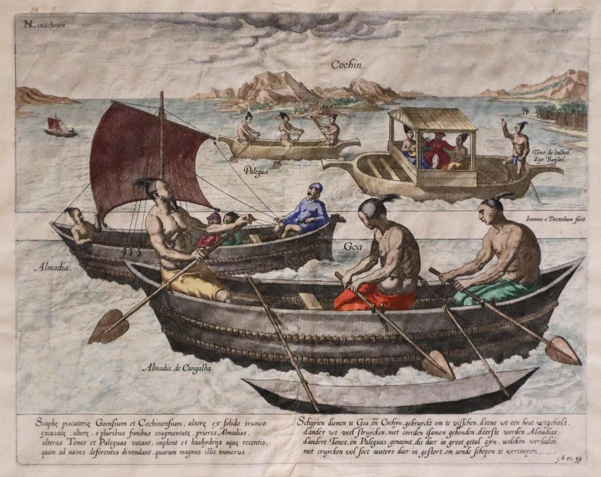 An early engraved view of boats or barges used in Cochin and Goa. Text panel beneath describing how these vessels hollowed out of wood were used for fishing, transporting people and selling fresh water to ships. 12 1/4 x 9 3/4 inches. Original centre fold. Attractive later hand colouring. Good condition.