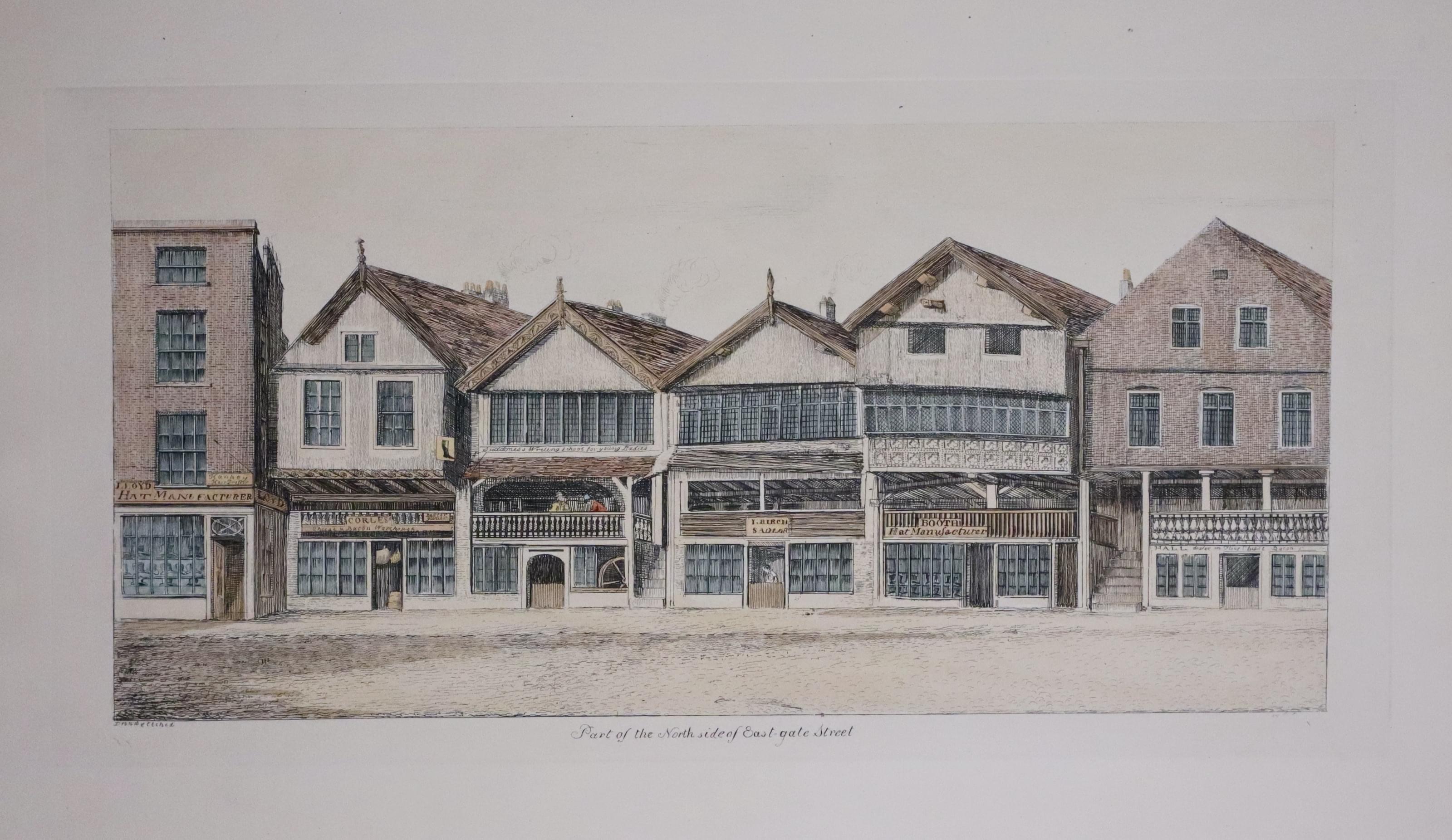 PART OF THE WEST SIDE OF BRIDGE STREET 1816. This is the 1880 edition of a view first published circa 1816. An amazing record of the shops and buildings at this time in Chester. 14 1/4 x 7 inches. Attractive hand colouring. Good condition.