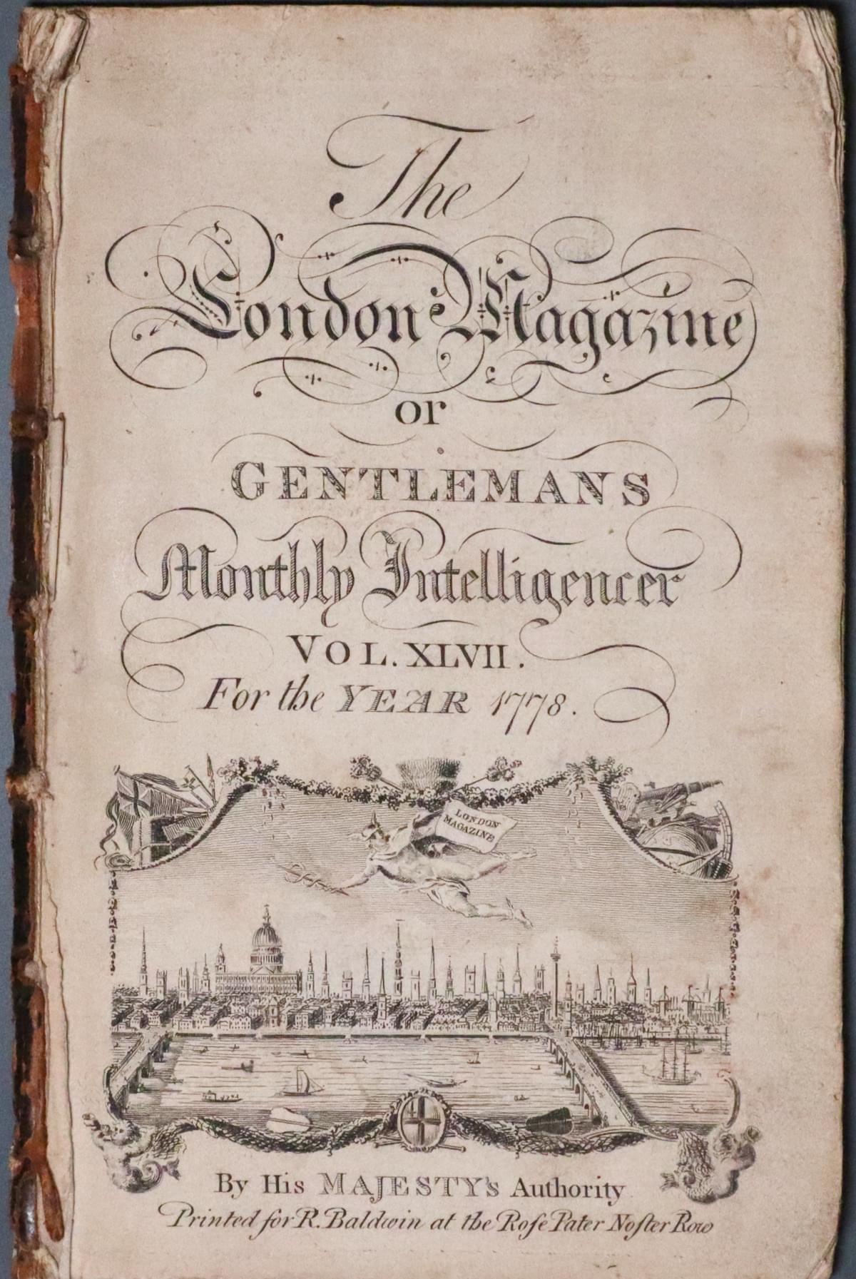 A section from The London Magazine for 1778. Starting with the title page and running to page 48. Articles on The Glaciers in Switzerland, Censure and Praise, Female Virtue, Young Man of Fashion. At page 24 From an Italian at Pekin there is a full page map showing part of China with part of Sichuan. It indicates the road to Tibet. Compass pointer. 4 x 6 inches. Text continues with The Hypochondriack and The British Theatre.