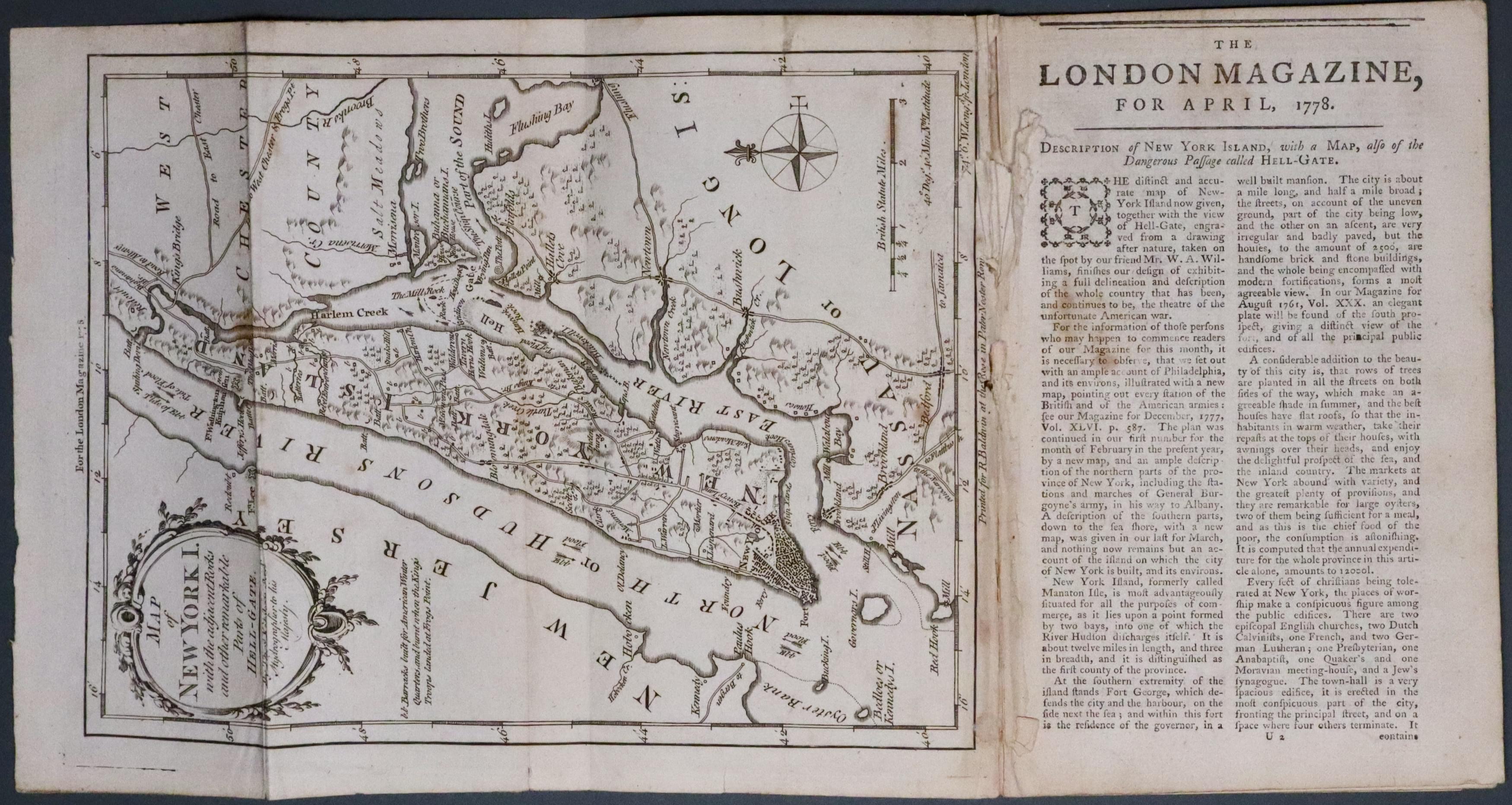 An interesting engraved map showing the area of Long Island and part of West Chester County. Also the notorious Hell-Gate where so many vessels perished owing to the unusual tides. Rococo title cartouche, compass pointer and scale. Still bound into the April 1778 part of The London Magazine running up to page 192 and the index page for April. Some slight damage where the map is bound effecting part of the imprint of the R. Baldwin with a very short tear passiing over the printed border into blank area. 9 1/2 x 7 1/4 inches. Uncoloured.