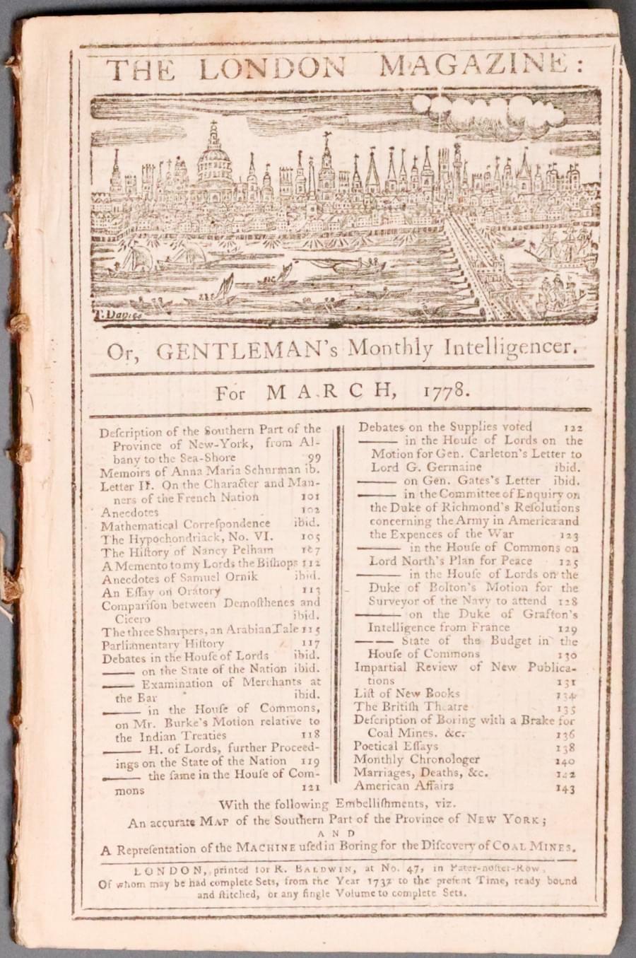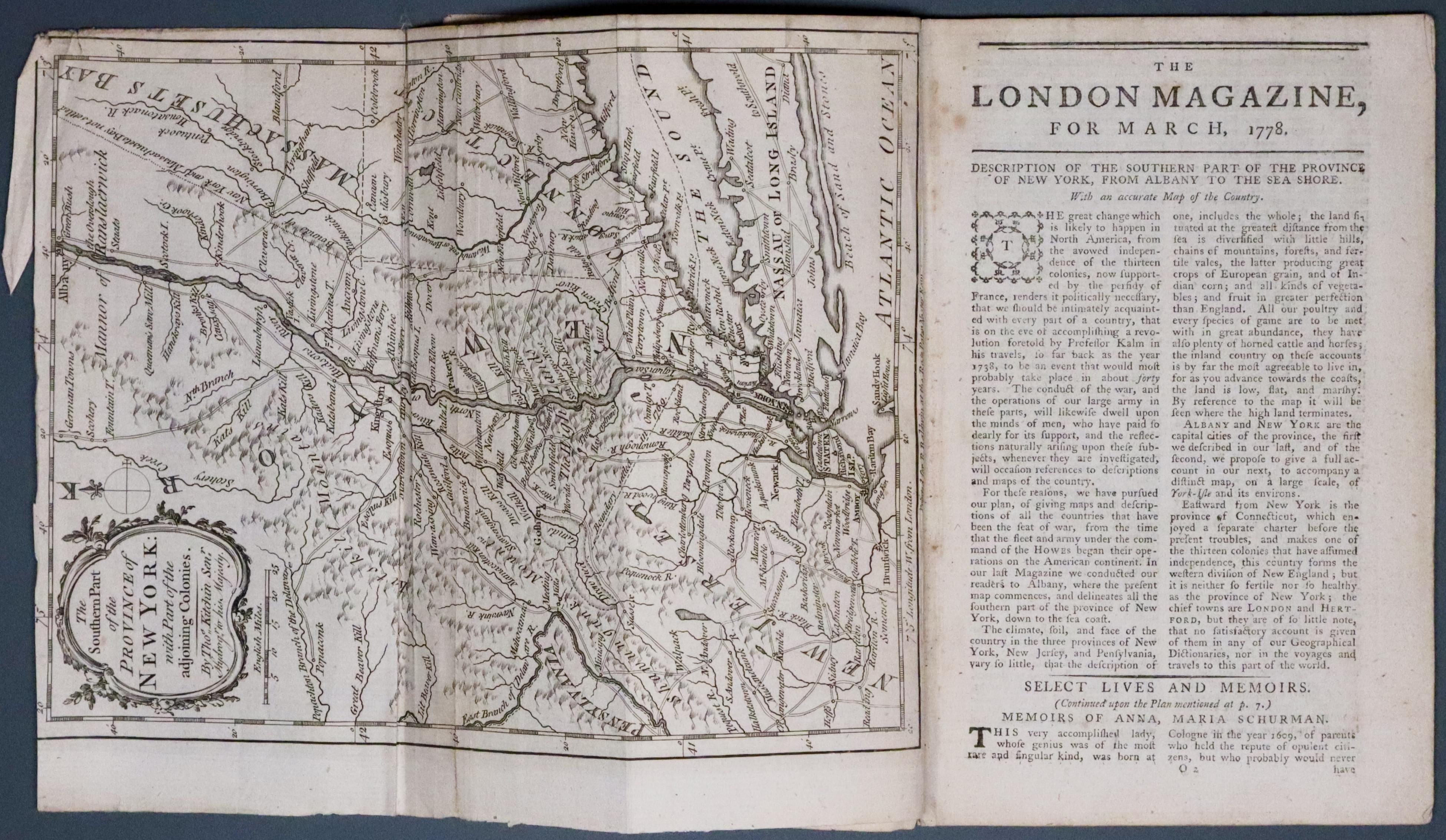 Part of The London Magazine for March 1778. Includes the index page with a view of London. The engraved map of Southern New York during the American Revolution by Thomas Kitchin. This extends from Albany to Long Island including parts of Massachusets Bay), Connecticut, and New Jersey. Two original fold creases. Part of the top blank margin is missing with a small portion of the top printed border. 7 x 9 1/4 inches. Uncoloured. The pages of the magazine from 99 to 144 including one page illustrating Boring Machine for the Discovery of Coal Mines.