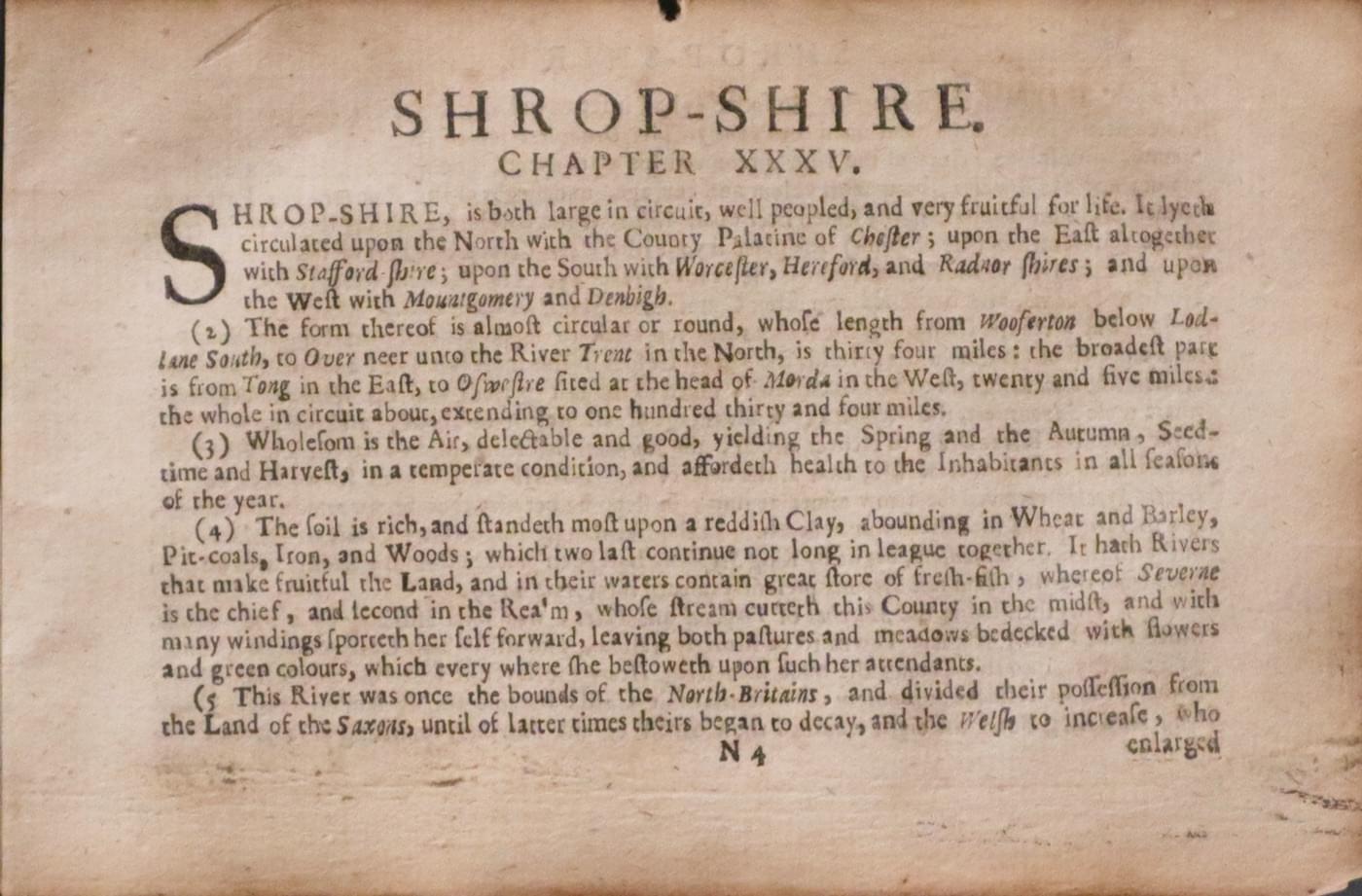 A fine early map of the county of Shropshire with a panel bearing the name of the cartographer John Speed and the name of the publisher George Humble. A tall strap work cartouche bearing the title, royal arms, two other coats of arms and the compass rose. Interesting inset town plan of Shrewsbury. A depiction with a description panel of the Battle of Shrewsbury fought on 21st July 1492 between an armtyled by Kind Henry IV and a rebel army led by Henry :Harry Hotspur” Percy of Northumberland. 20 x 15 1/8 inches. Uncoloured. Light printer’s crease to the left of the original centre fold. Description pf the county in English on verso with a long list of towns and villages. Four small light brown matching areas. Small area of the top right printed border expertly repaired. Otherwise a nice specimen having been taken straight from the atlas and therefore never been sold as a single map in its long life.