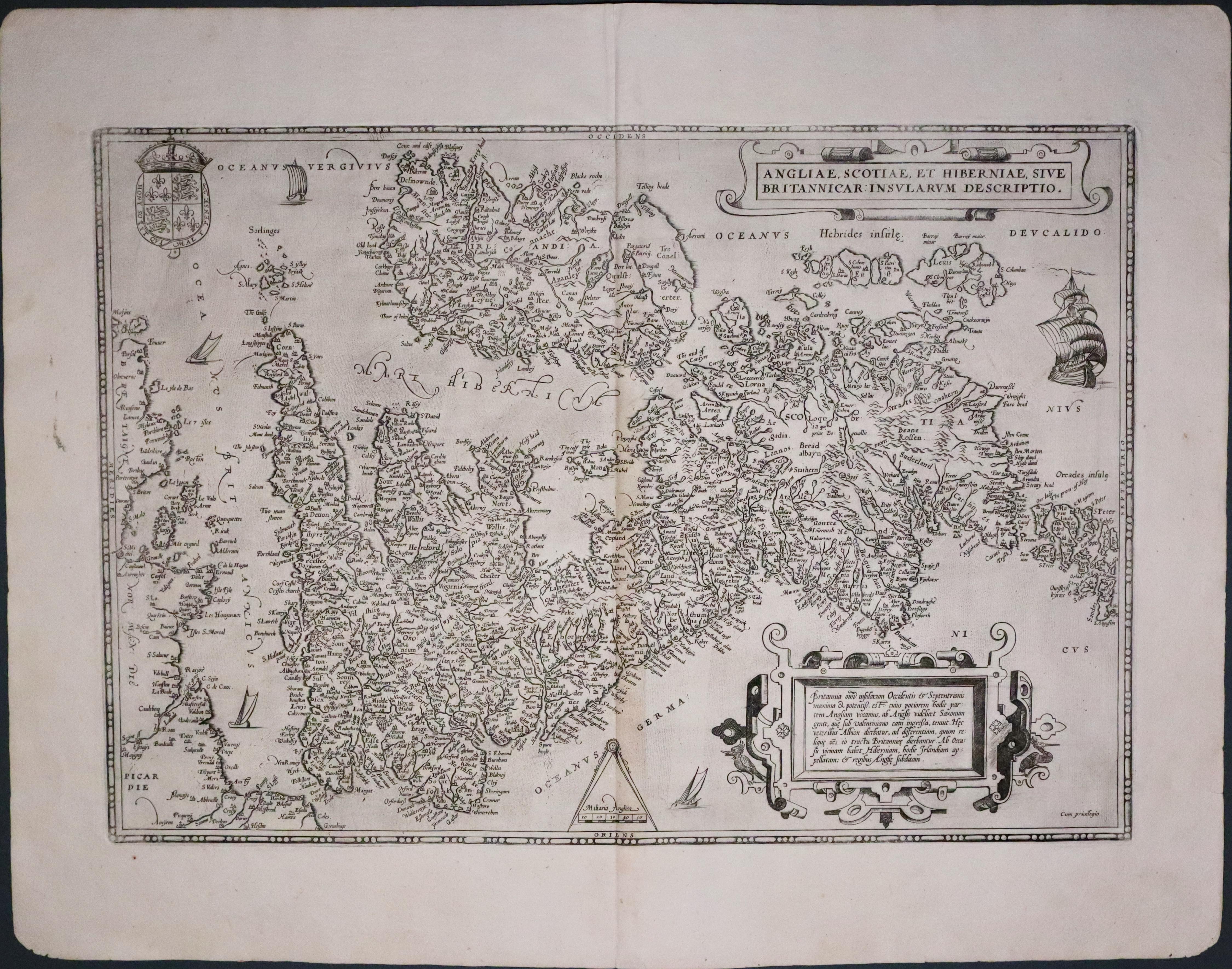 A fine early map of the British Isles orientated with west at the top. It is based on Gerard Mercator’s earlier map of the British Isles in 1564.Embellished with two decorative cartouches. Scale with pair of dividers. Royal Arms. Ship. Latin text on verso. 19 1/2 x 13 1/2 inches. Orignal centre fold. Nice clean condition with large blank margins. Uncoloured
