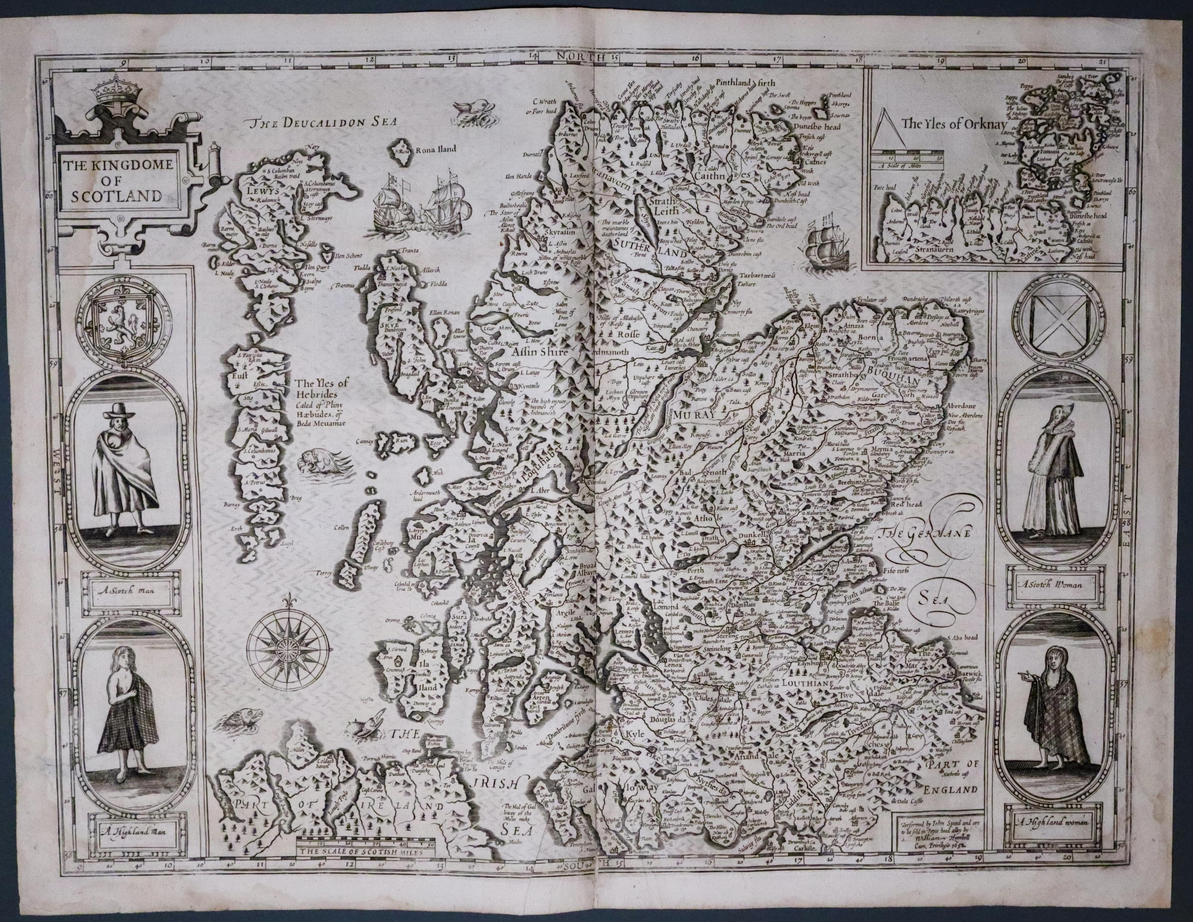 The second version of John Speed’s. There is a quick way to identify this. In the 1611 edition the four panels that portray figures showed King James, his wife Queen Anne and their two princes Henry and Charles. Following the execution of Charles I in January 1649 the publishers no doubt thought it was improper to illustrate an executed king and his family. So the images were replaced with the figures of simple commoners. A Scotch Man, A Highland Man, A Scotch Woman and a Highland Woman. Although Charles II regained the throne in in 1660 the large edition of Speed’s atlas in 1676 still kept these images. The map has a title cartouche, two coats of arms and an inset map of the Orkney Islands. Three sailing ships and three sea monsters. The publishers panel shows the name of William Humble dated 1650. English text on verso. Original centre fold. 20 x 15 inches. Uncoloured. A little damp staining in the top left and right corners and side blank margins. Some expert restoration to the good sized blank magins. Otherwise a nice specimen of this important map. This map has been taken straight from the atlas and therefore not been previously sold as a single map.