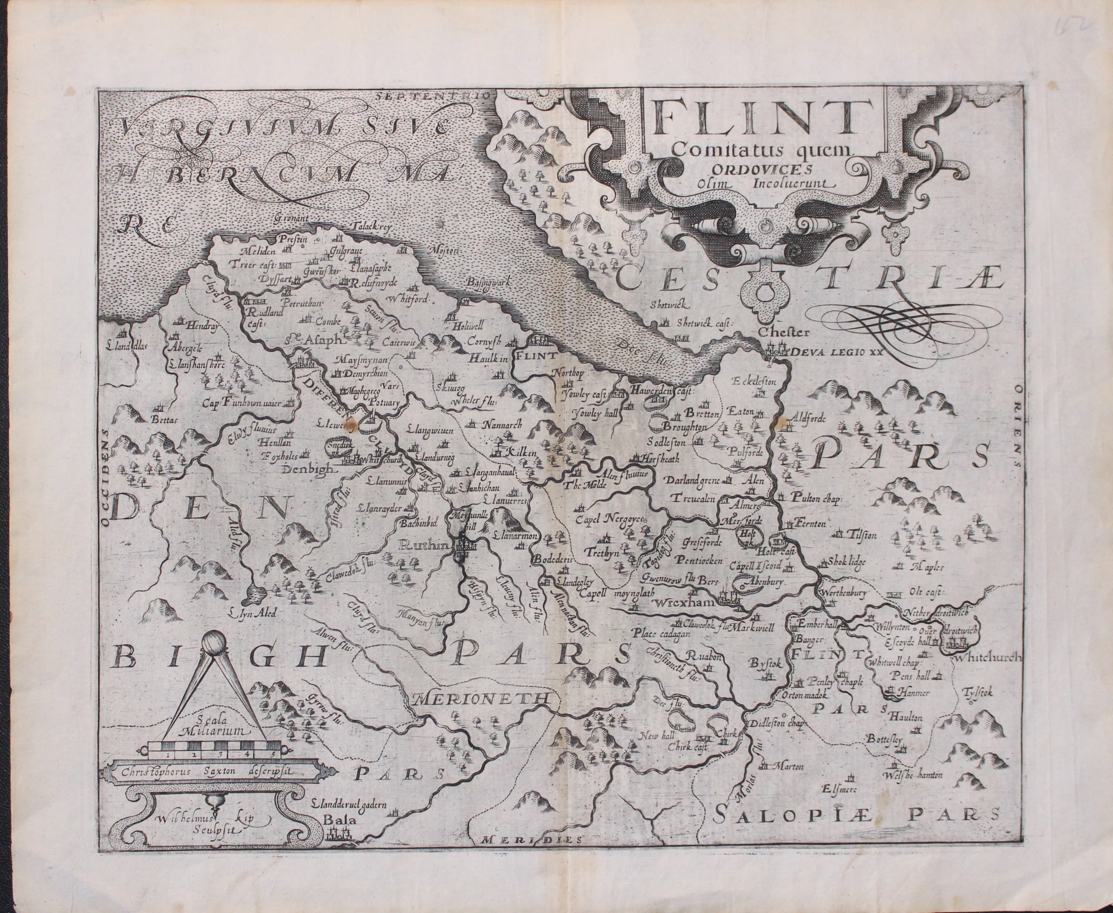 An early engraved map of the county after the survey by Christopher Saxton. Decorative title cartouche. Scale with pair of dividers which bears the name of Christopher Saxton and the engraver William Kip. 12 3/4 x 10 1/2 inches. Uncoloured. Good condition. A nice clear impression. This is the first printed map of the country as Christopher Saxton grouped Denbighshire and Flintshire together on one plate.