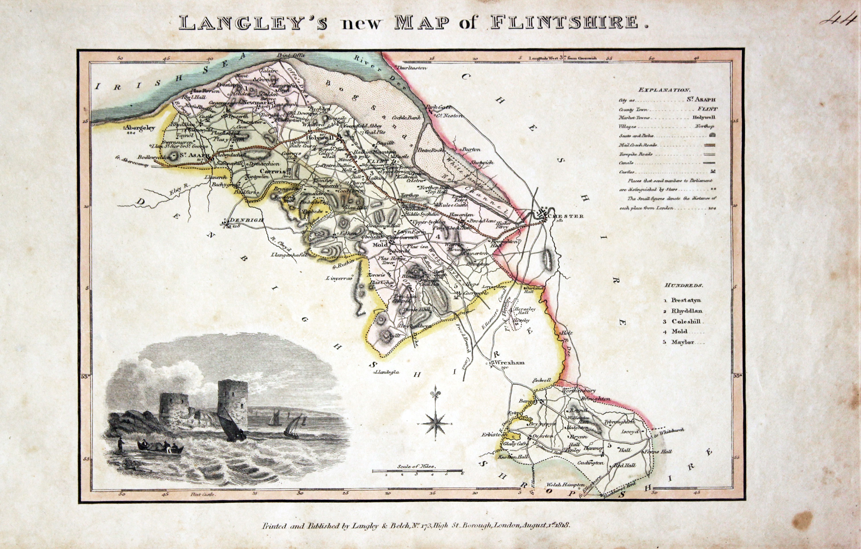 An engraved map of the county. In the bottom left hand corner is a vignette view of Flint Castle. The title appears above the map. Beneath the map is the publishers imprint Printed and Published by Langley & Belch, No. 173 High Street, Borough, London, August 1st, 1818. 10 x 6 3/4 inches. Manuscript number 44 in the top right hand corner. Original outline and wash hand colouring. A little light toning and some speckled foxing in the blank margins. No tears or repairs.
