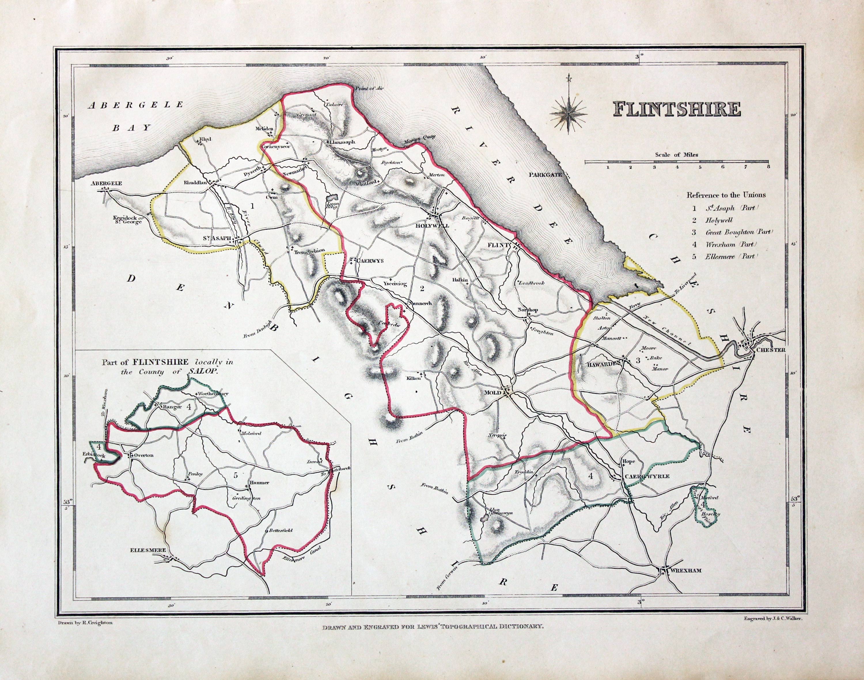 FLINTSHIRE A detailed engraved map of the county with explanation and list of hundreds. Publisher's imprint dated 1809. 8 x 6 inches, 220 x 173 mm. Fine early wash hand colouring. Good stout paper with wide blank margins. Good clean condition.