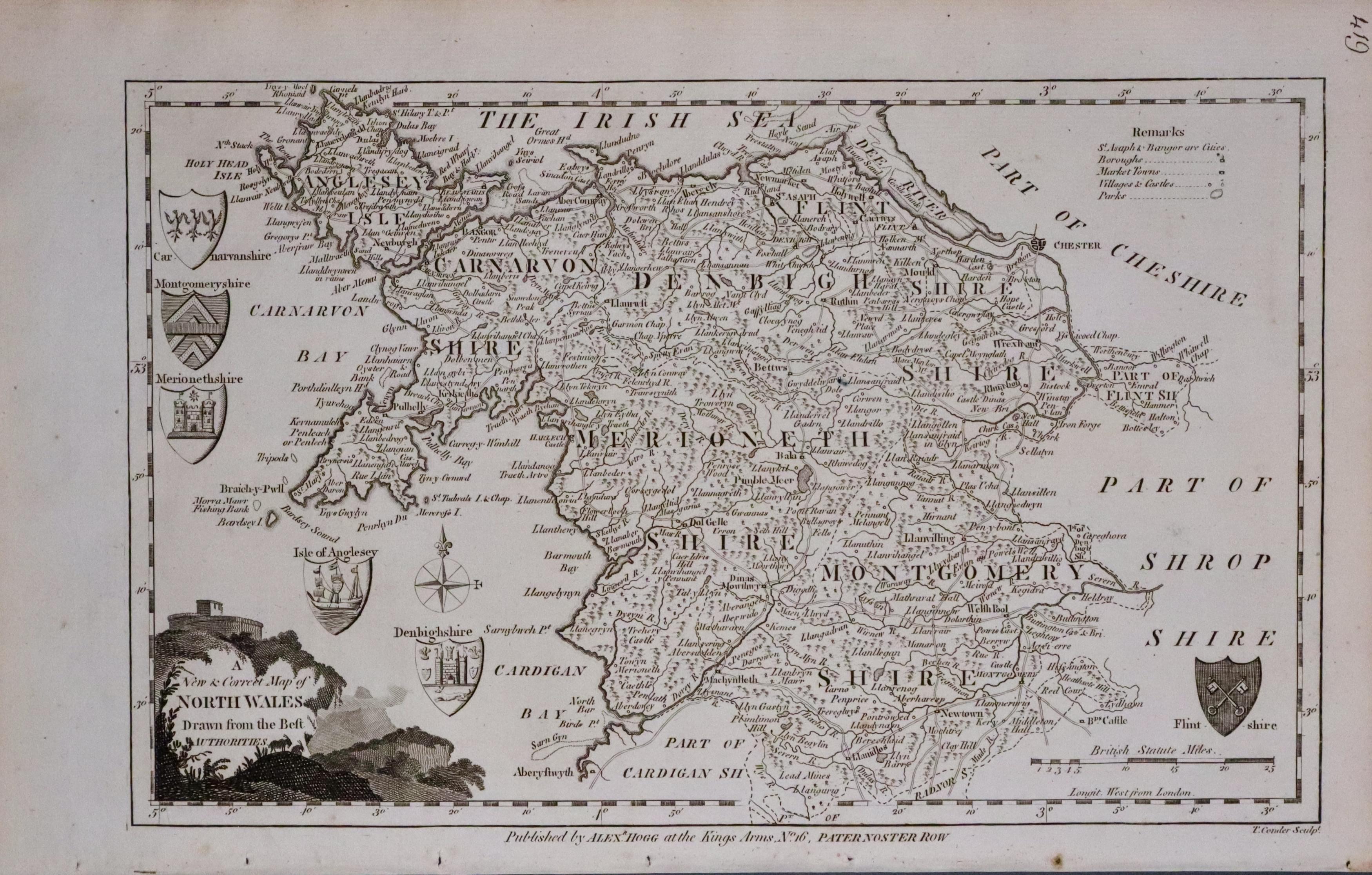 A map of North Wales divided into counties, engraved by T. Conder. Embellished with a pictorial title cartouche and six coats of arms. 12 1/2 x 7 3/4 inches. Uncoloured. A few binding hole nich on the edge of the bottom of the blank margin. Good clean condition. Straight from the atlas and not sold as a single map before.