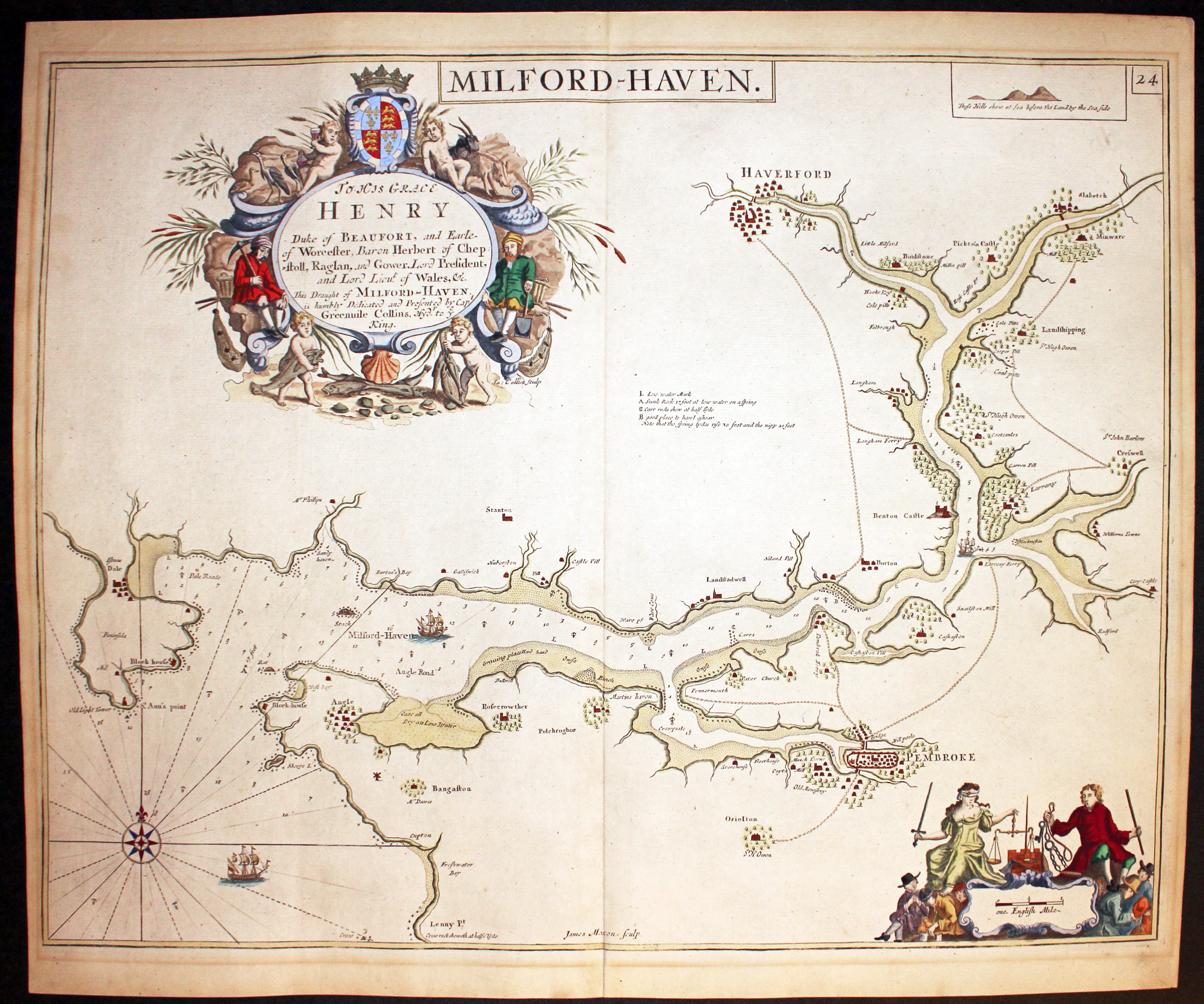 A fine chart of Milford Haven with Haverfordwest and Pembroke. Engraved by James Moxon. The dedication to the Duke of Beaufort is displayed within a large decorative cartouche with putti, figures and coat of arms. 22 x 17 inches. Uncoloured. Good condition.