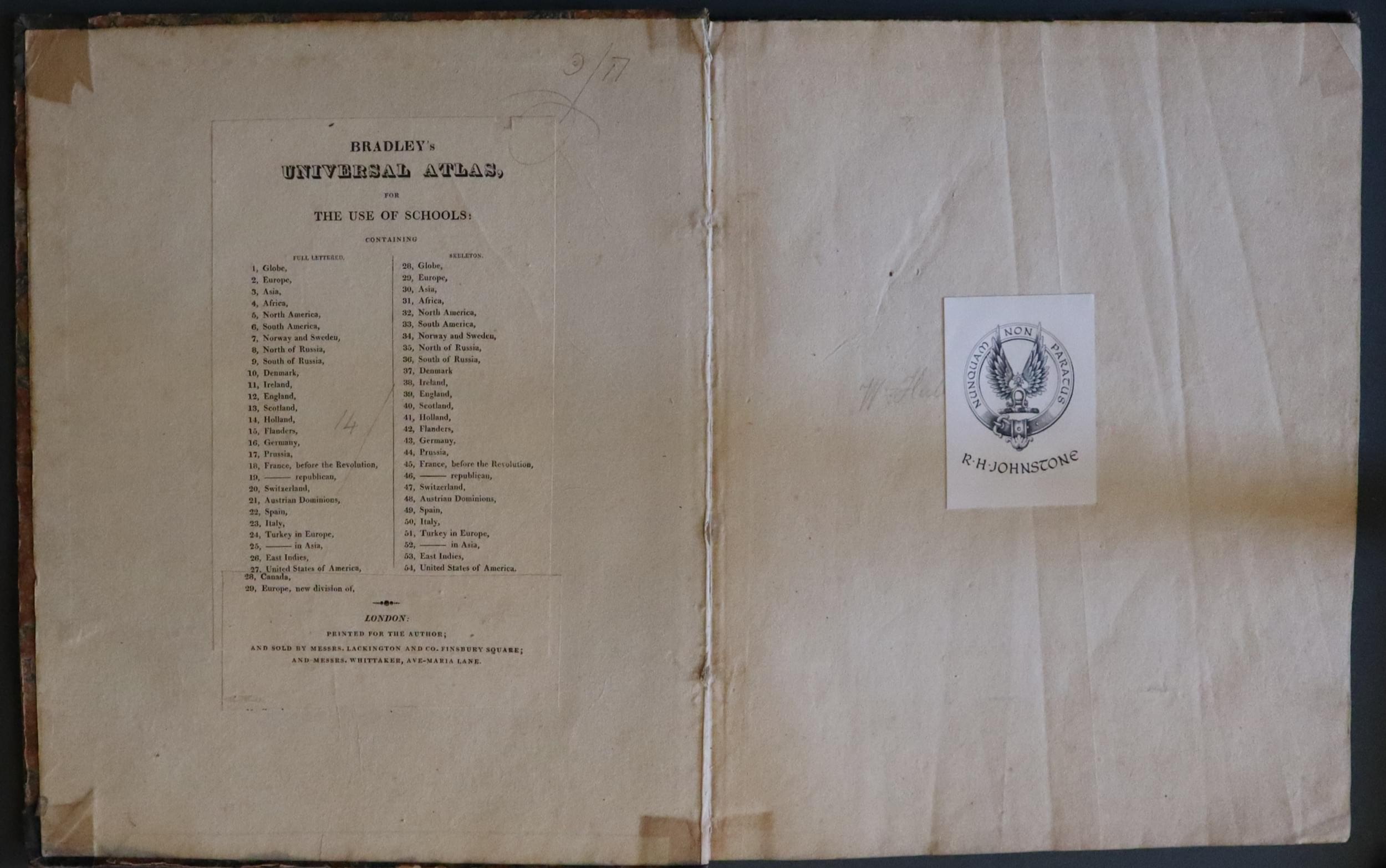 No title page to this atlas which is possible missing. The title is shown on a pasted page onto the inside of the front board which lists the maps to which an additional piece of printed text has been pasted listing two further maps - Canada and New Division of Europe. Printed for the Author; and Sold by Messers. lackington and Co. Finsbury Square; and Messers. Whittaker, Ave-Maria Lane, London. There are 29 normal hand coloured engraved maps each bearing a publishers imprint “Engraved for J. Bradley’s Elements of Geography. These are followed by 27 hand coloured engraved maps titled but having no place names. Designed for educational use. Small corner missing of the wide blank margin on the Austrian Dominions map. Otherwise the maps are in nice order. Scattered very light browning on some maps but otherwise a nice specimen. Marbled boards with printed text showing through or transfered from with pasted title label. Quarter bound. Bookplate of R. H. Johnstone. UK posting only